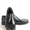 These black leather penny loafers from Loake are a precise study in traditional craftsmanship. Made with a high-shine polished finish and leather soles, they reflect a clean, structured silhouette. The apron toe and signature saddle strap are subtle nods to mid-century design without drifting into nostalgia.