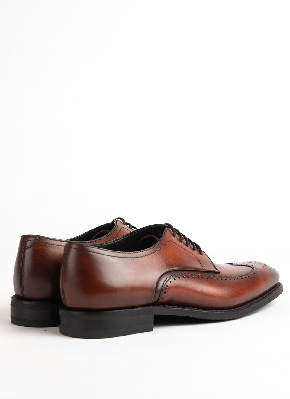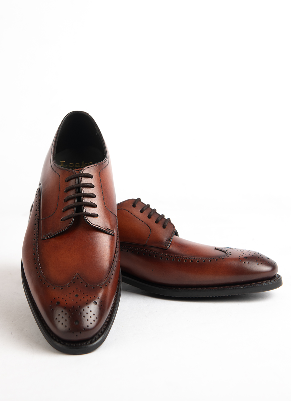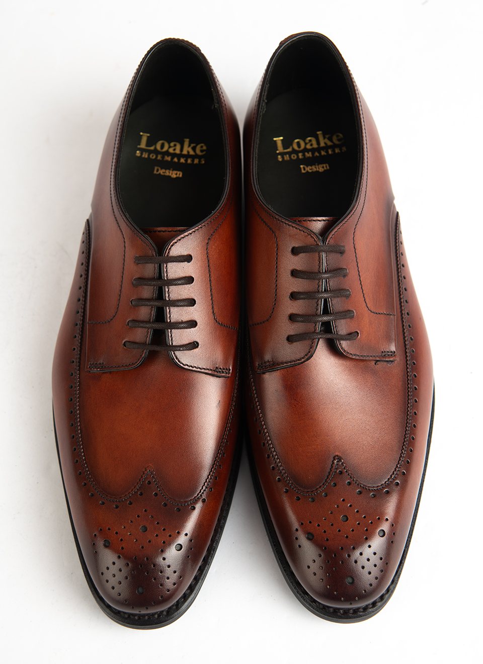 These Loake brogues in rich tan calf leather are built on a traditional last, with a full wingtip design and detailed perforations that give them their unmistakable character. The soft burnish across the toe and quarters adds visual depth, while the open lacing keeps them rooted in the Derby tradition—formal, but with a slightly more relaxed edge than an Oxford.