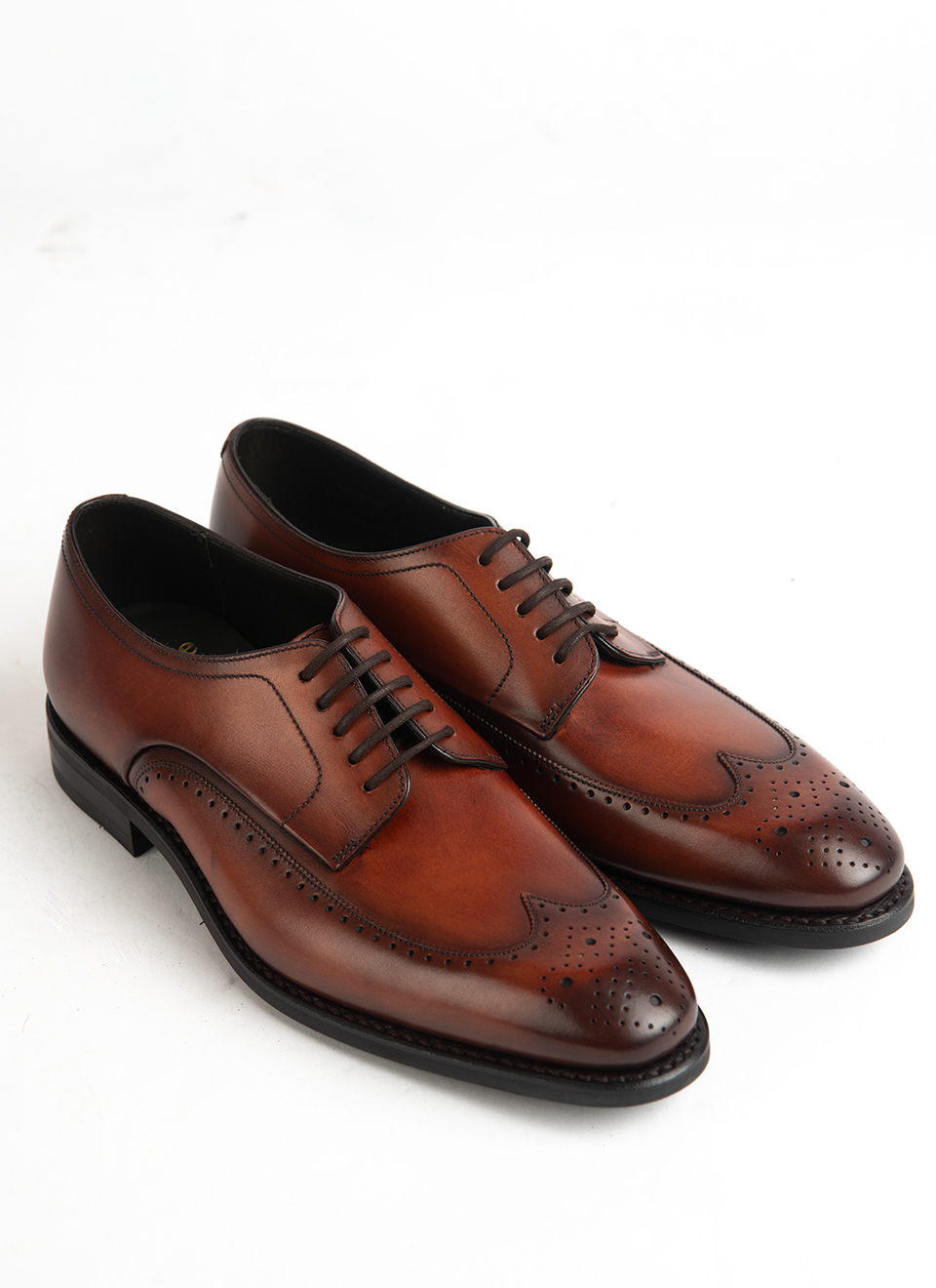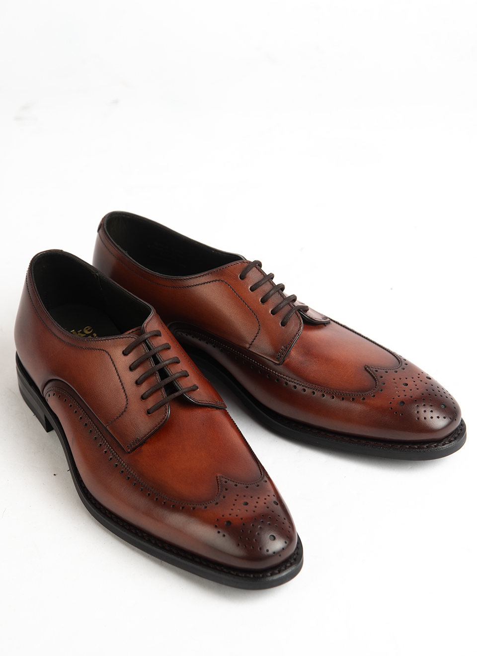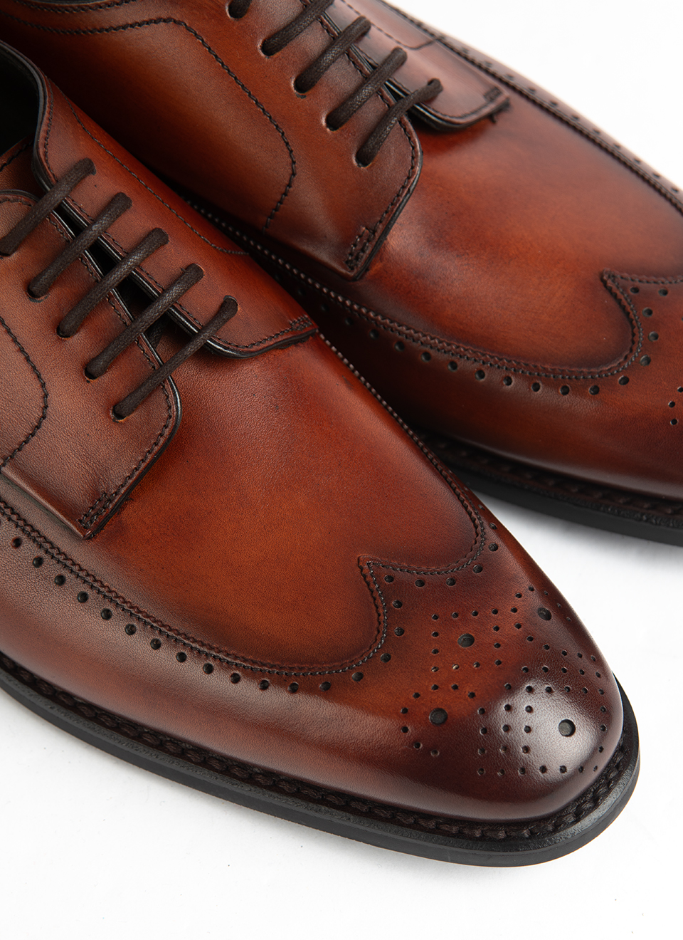 These Loake brogues in rich tan calf leather are built on a traditional last, with a full wingtip design and detailed perforations that give them their unmistakable character. The soft burnish across the toe and quarters adds visual depth, while the open lacing keeps them rooted in the Derby tradition—formal, but with a slightly more relaxed edge than an Oxford.