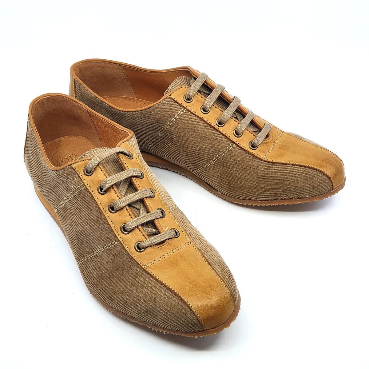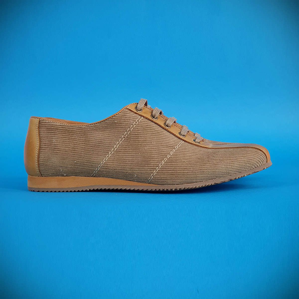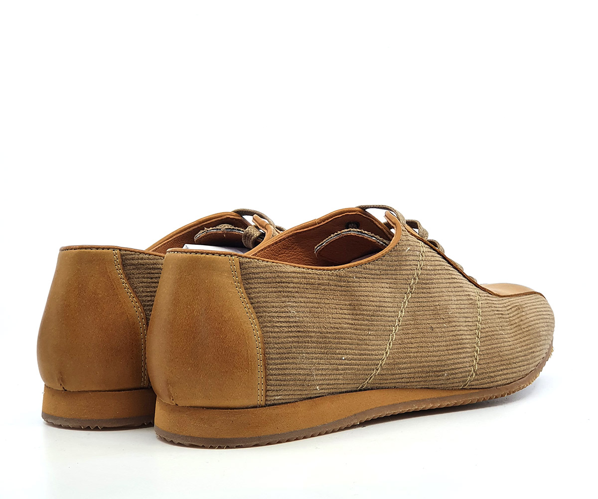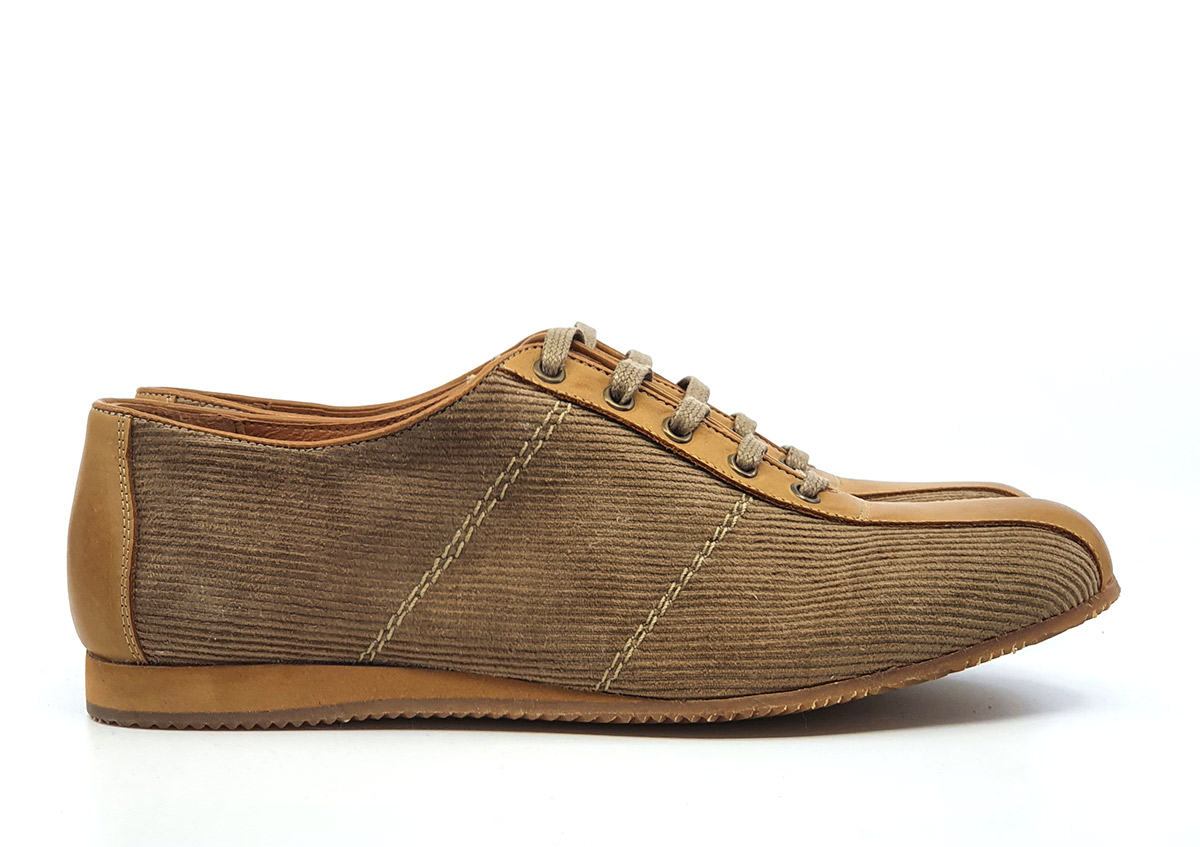 A most excellent trainer shoe that is too beautiful to risk training with! The buttery-beige grain leather trim really stands out against the dull tan cord upper. The laces are perfectly color coordinated of heavy-wearing fabric. The wife digs the old-school trainer sole (which is also color coordinated with the leather trim). Aesthetically on point and roomy enough to wear w/ metatarsal inserts or crew socks.