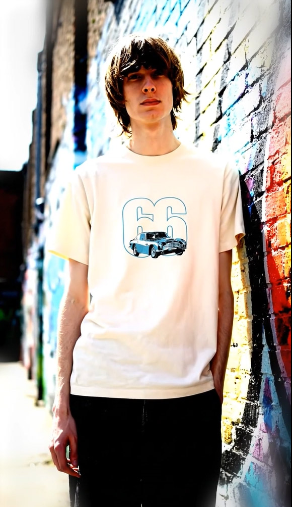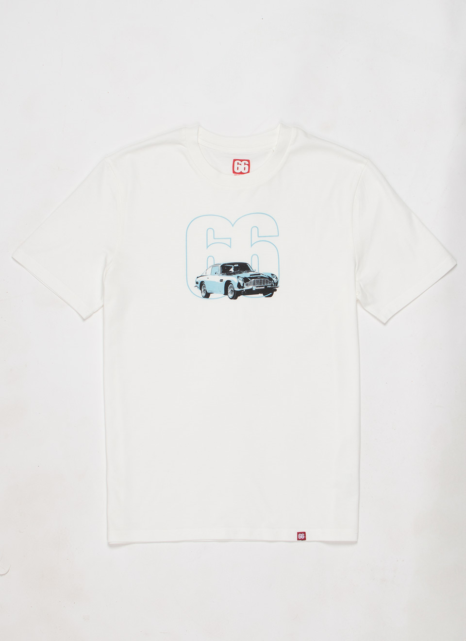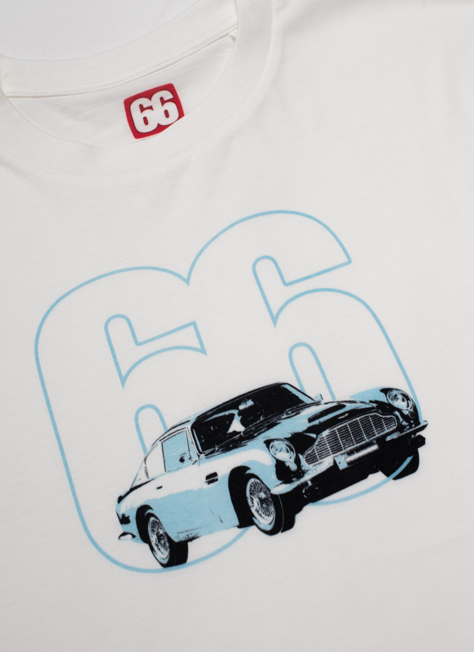 A crisp white version of the same Aston Martin car and “66” motif, with light blue tones accentuating the print. The design contrasts cleanly against the white background, giving it a fresh, heritage-sport look.