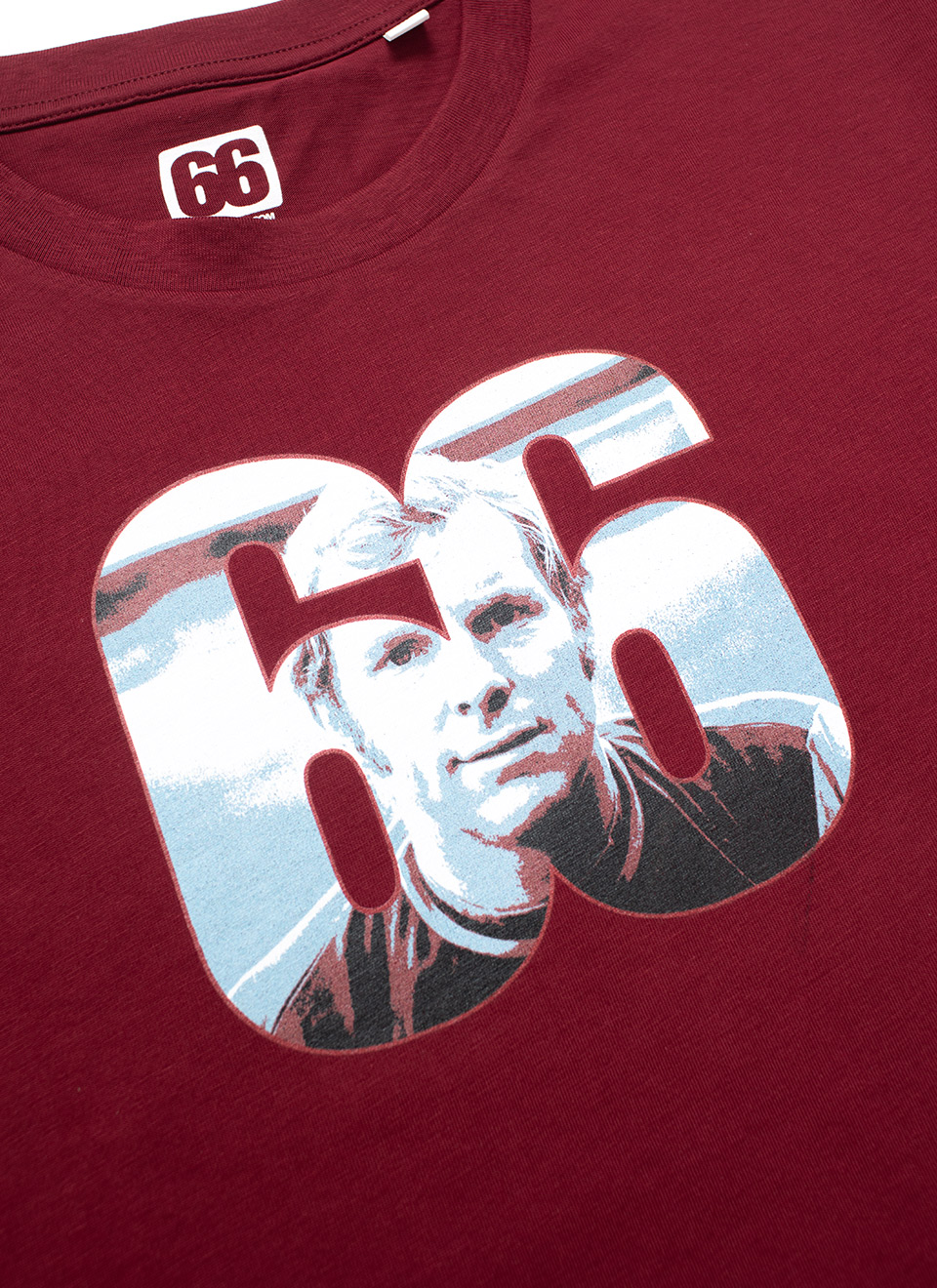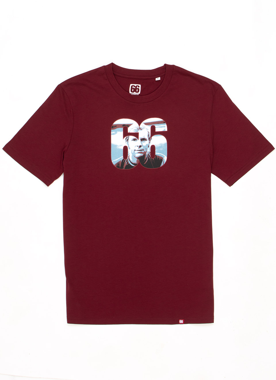 A rich burgundy tee displaying the bold “66” filled with a portrait of Bobby Moore, England’s iconic 1966 World Cup captain. The photo treatment uses soft blue and grey tones, set within the number, giving it a nostalgic, heroic feel.