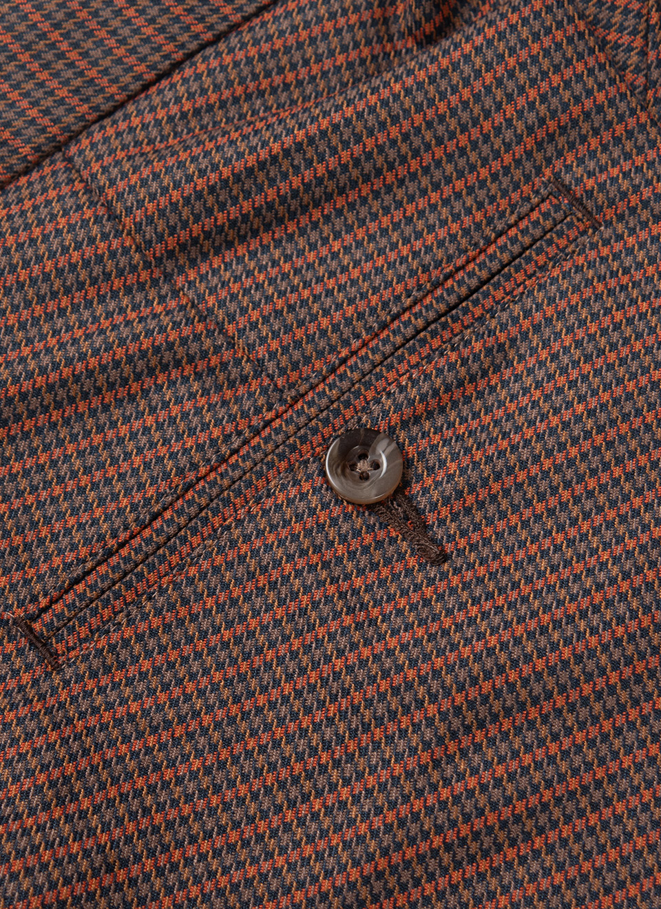 The fine check weave—set in warm brown with subtle rust and navy tones—adds depth and character without feeling over the top. It’s a pattern that leans slightly vintage, with a hint of seventies colour, but still sits comfortably in a modern wardrobe. It pairs easily with knits or simple tops, giving just enough interest without doing all the talking. Worn with a Gabicci fine-gauge polo, there’s a natural nod to that early-seventies smartness. Switch to a 66 Clothing knit for a more relaxed, mod-inspired look that still feels considered. On the feet, Modshoes loafers or brogues work perfectly with the tapered line, keeping everything grounded in classic style.