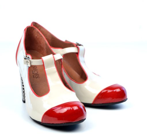 The Cream & Red patent leather, has such a great look about it, and when combined with the black piping, enable these shoes to fit in with many outfits. Notice the detail on the heel, which we have never seen before. Have a look at the pics below, and you can see just how unique these shoes are.