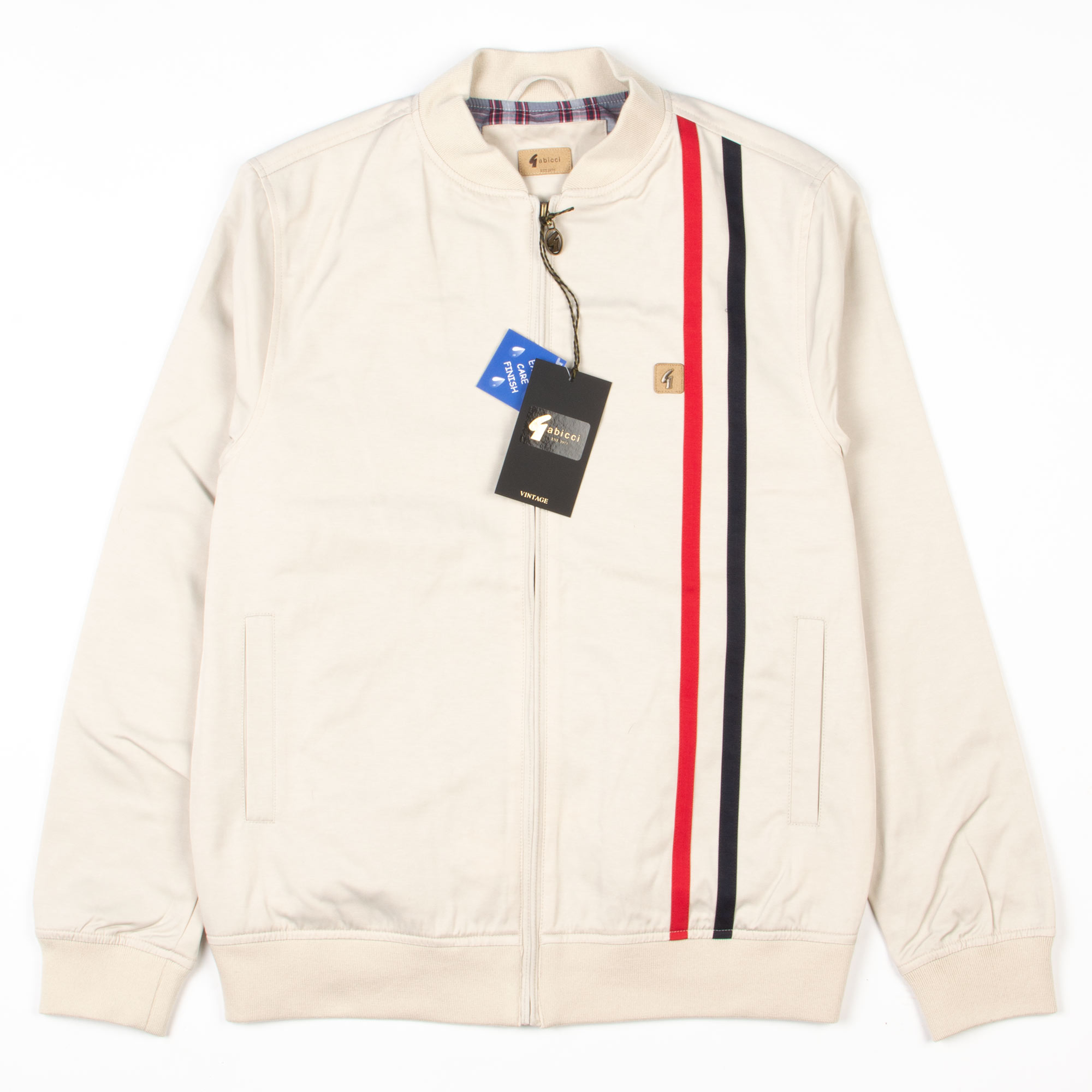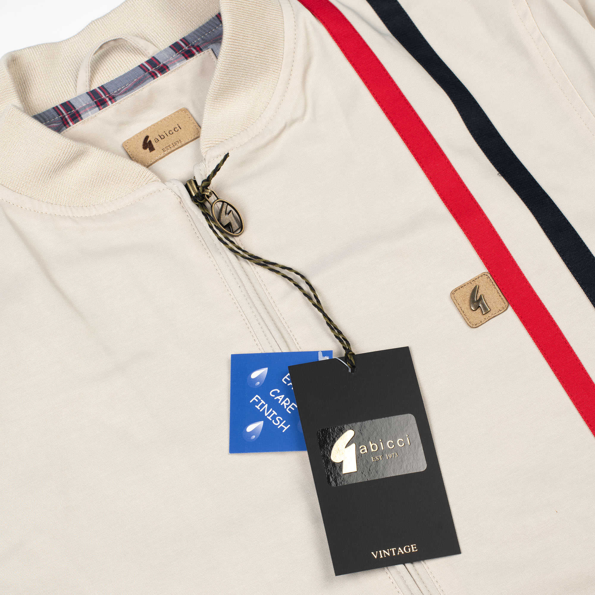 Add a bold touch of vintage flair to your outerwear with the Griffin racing-style jacket in classic cream from the Gabicci Vintage Spring/Summer 2025 collection. Featuring sharp contrast vertical stripes in red and black down the chest, this lightweight jacket nods to retro sportswear while keeping things clean and wearable. The full zip front, ribbed hem and cuffs, and funnel neck collar give it that authentic Harrington-style finish, while the Gabicci “G” tab adds the final seal of quality.