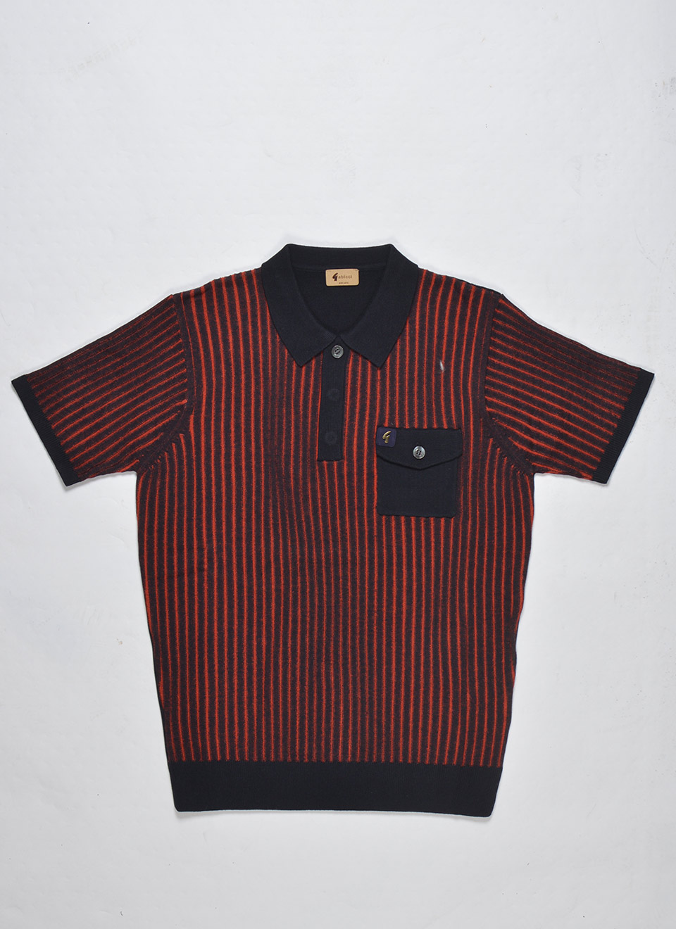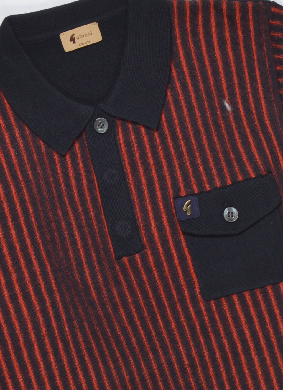 Introducing the Gabicci Classic Men’s Short Sleeve Knitted Polo Shirt in a bold black and red stripe design. This stylish polo shirt combines vintage charm with modern sophistication, making it a standout piece for any wardrobe.