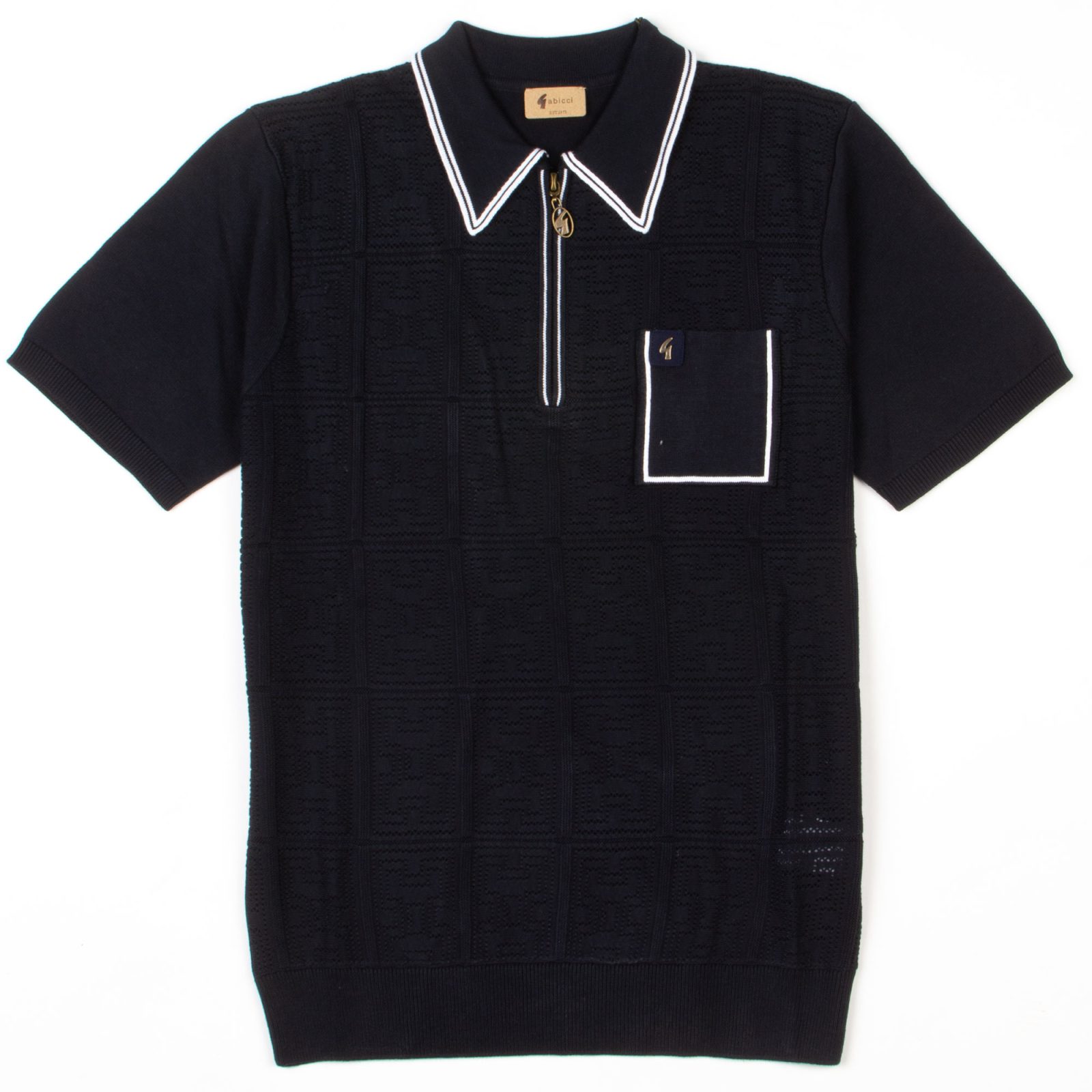Add a fresh dose of retro cool to your wardrobe with this standout piece from the Spring/Summer 2025 Gabicci Vintage collection. This crisp white short-sleeve knit polo effortlessly blends vintage charm with modern sophistication. Featuring a sharp zip-neck design, contrast tipping on the collar, and a statement chest pocket with the signature Gabicci “G” tab, it’s a piece that does all the talking. The subtle geometric knit pattern adds a premium textured finish, giving it that elevated edge without trying too hard.