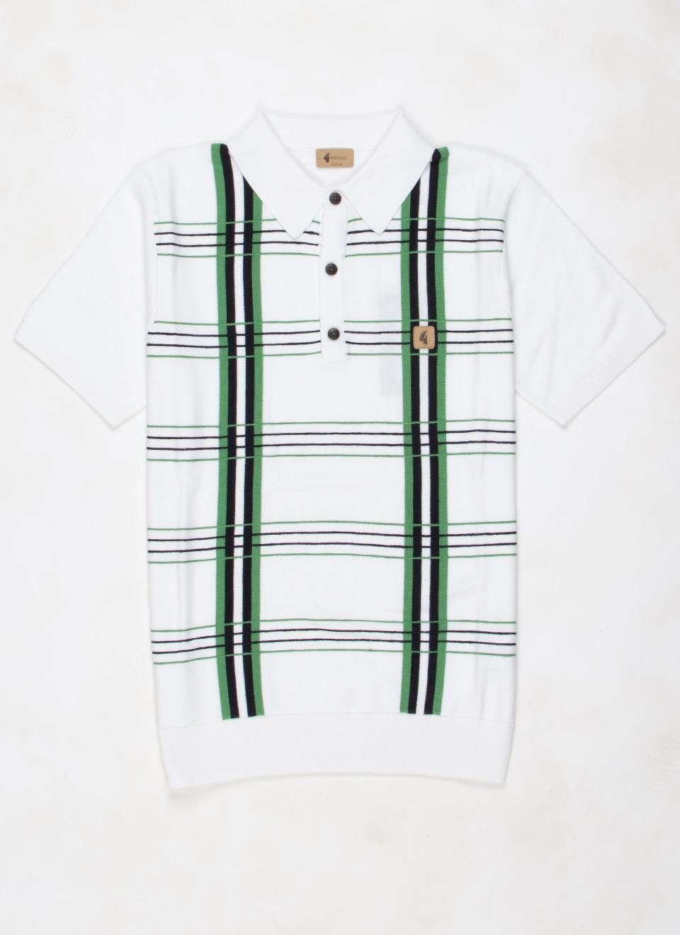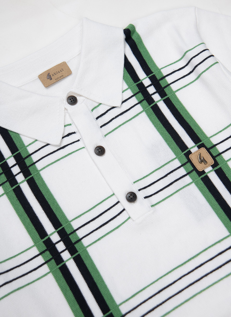This short-sleeve knit polo comes in a crisp white base with a standout check pattern in green, black, and subtle white accents. Designed with a ribbed hem and collar, it offers a clean, structured silhouette. The three-button placket and Gabicci’s signature chest badge give it a familiar touch. Lightweight and soft to the touch, it’s a comfortable option that works across different looks and settings.