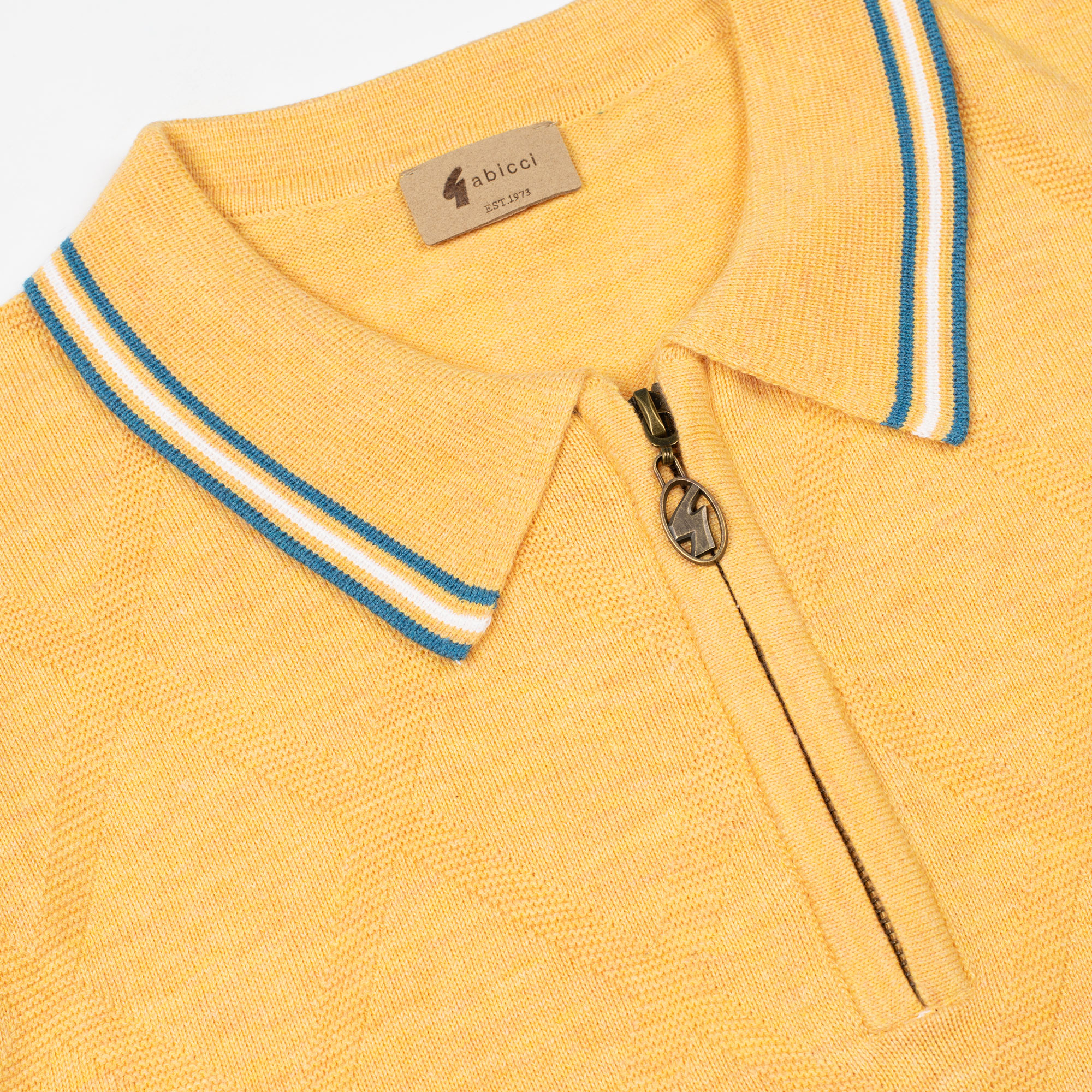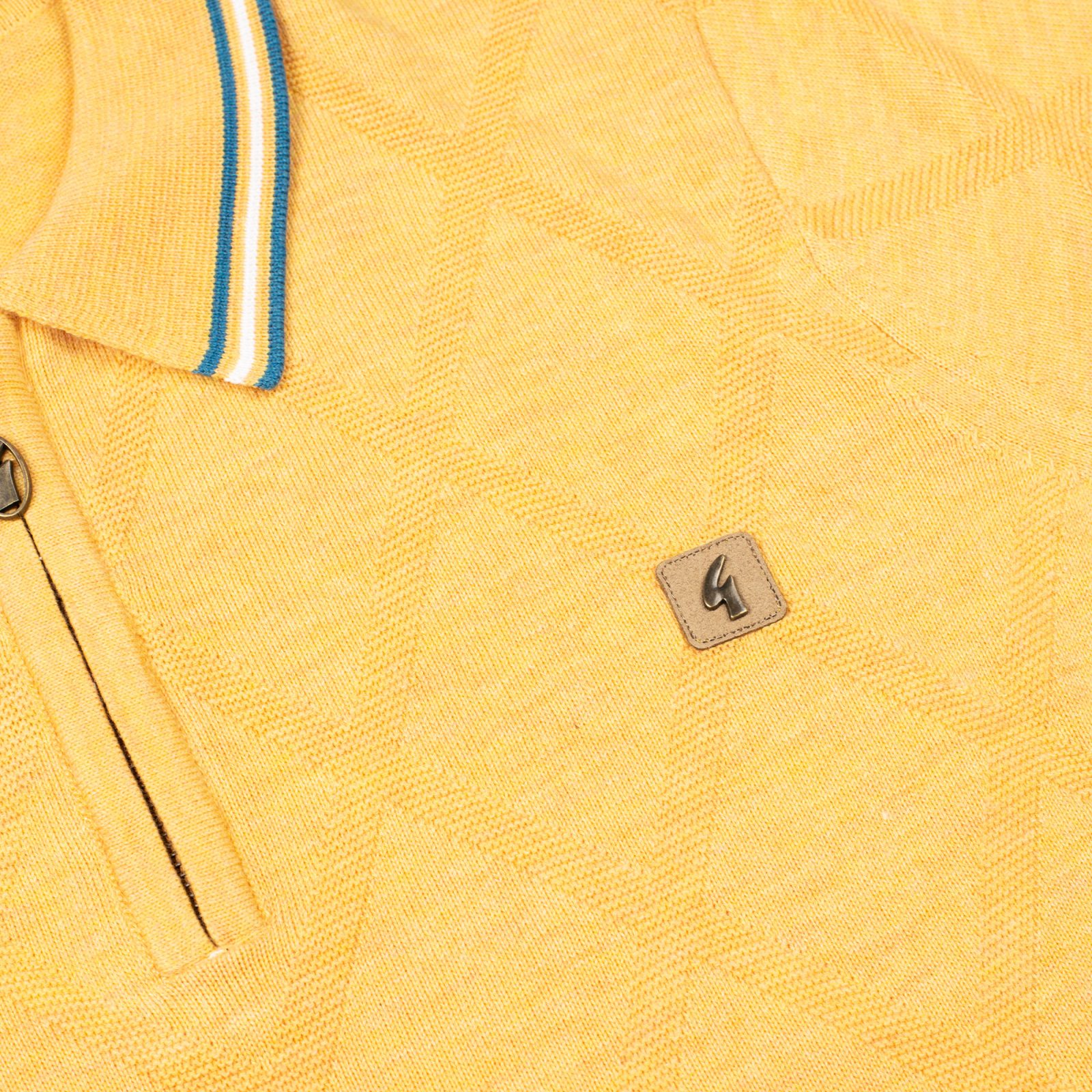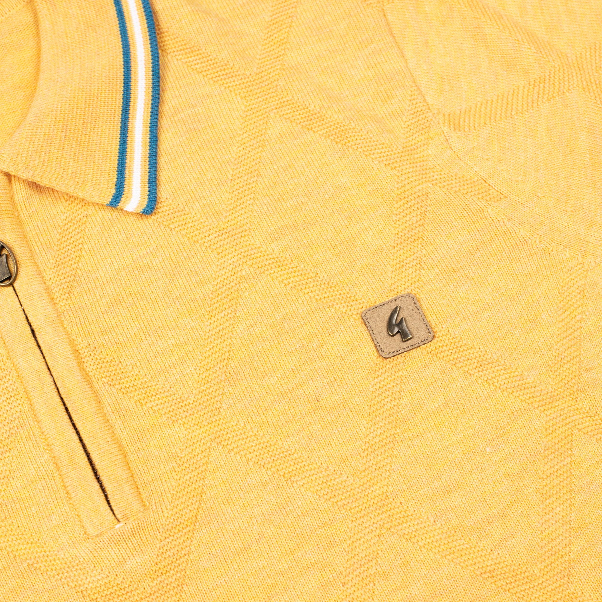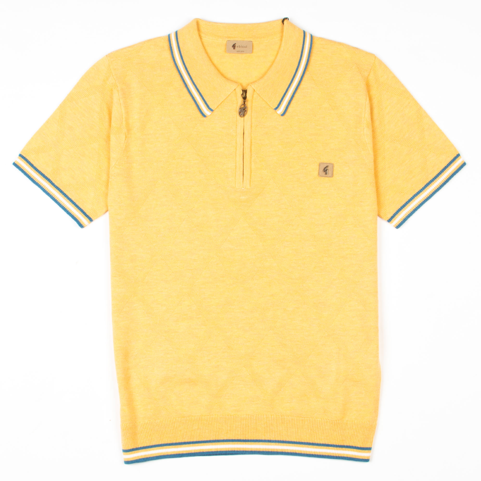 Brighten up your fits with this standout pineapple yellow zip polo from the Gabicci Vintage SS25 range. With its sunny hue, subtle diamond knit pattern, and zip collar, this piece gives off serious 70s and 80s weekend vibes. Finished with blue-and-yellow tipping on the collar, sleeves and hem, plus the iconic Gabicci badge, it’s full of personality.