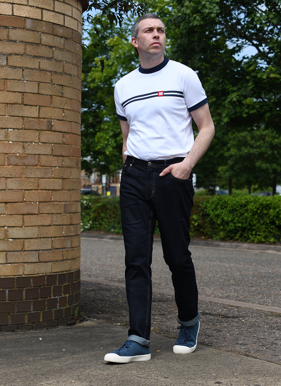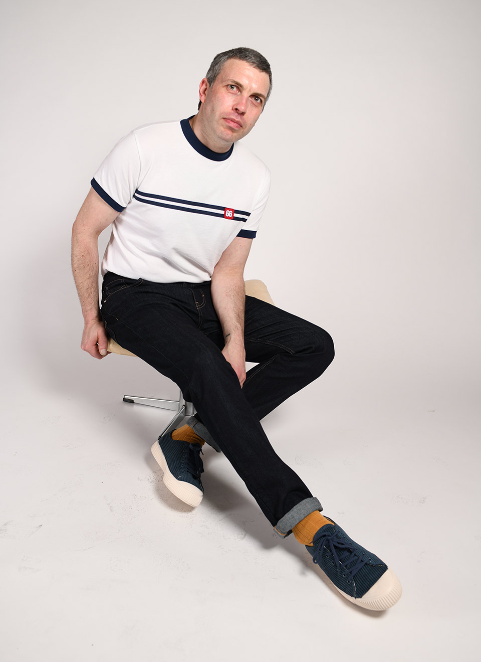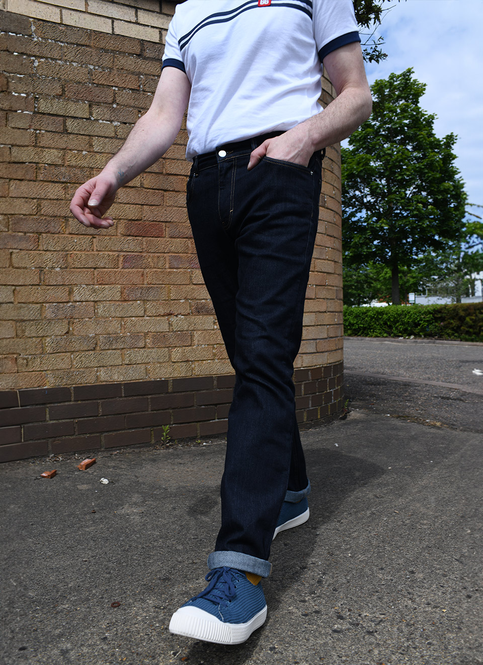 Dark denim jeans are incredibly versatile, pairing well with almost anything. They provide a clean, polished look that’s perfect for any occasion. One of my favorite outfits includes dark blue jeans, mustard socks that match the jean’s stitching, suede desert boots or cord shoes, and a 66 Top or T-shirt. It’s a classic ensemble, whether you’re running errands or attending a more formal event. This versatility allows wearers to dress their jeans up or down, making them suitable for both casual and semi-formal settings.