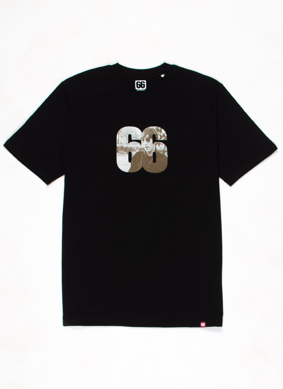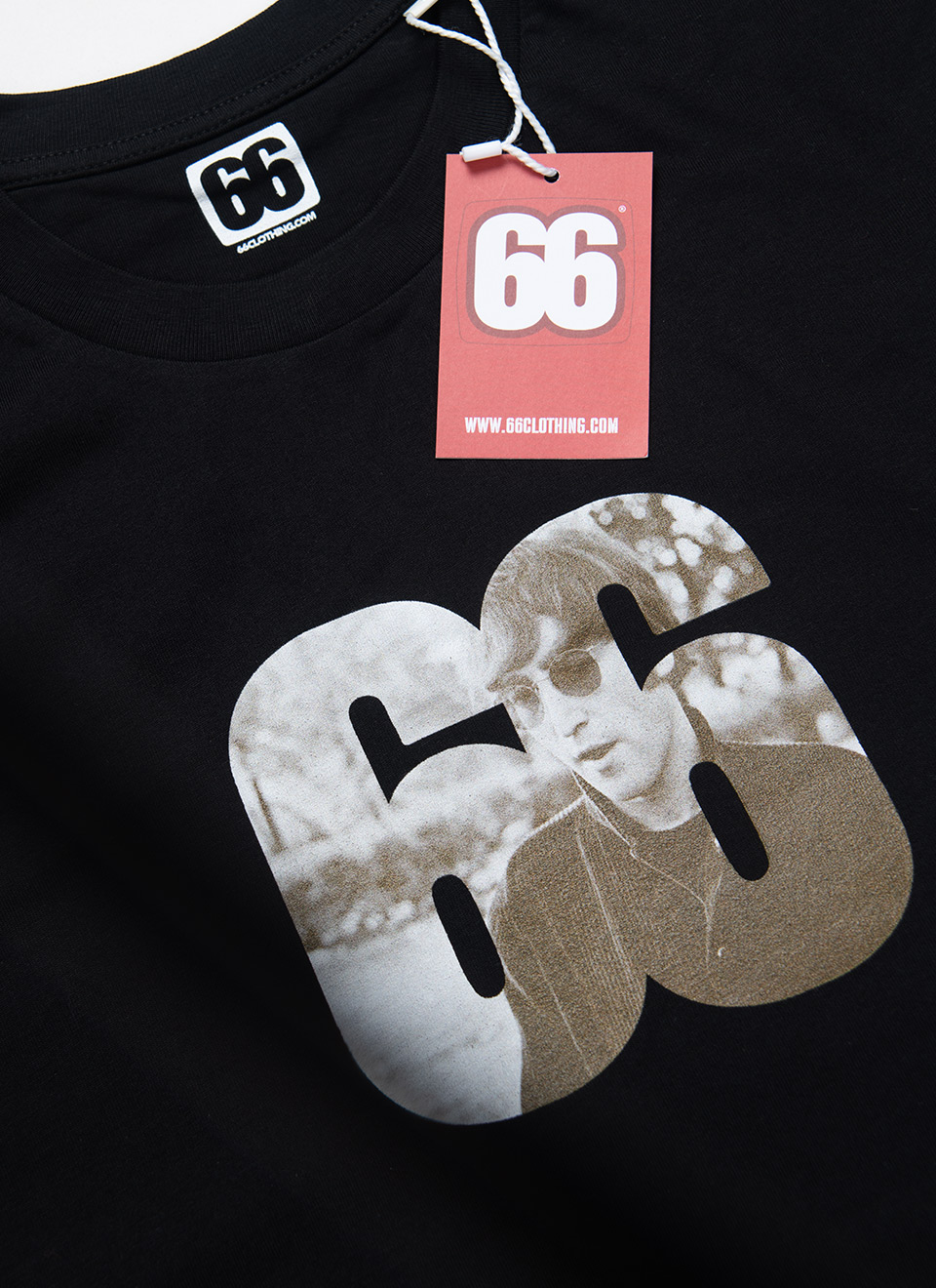 A sepia-toned Lennon captured during his mid-60s peak, subtly framed inside the 66 logo. It’s a moment in time – style, attitude, music – frozen in print. Black and understated