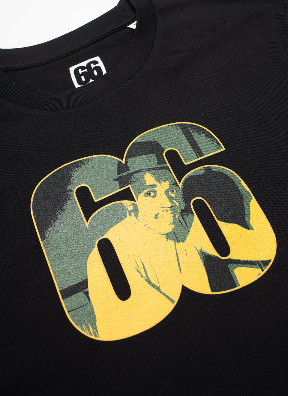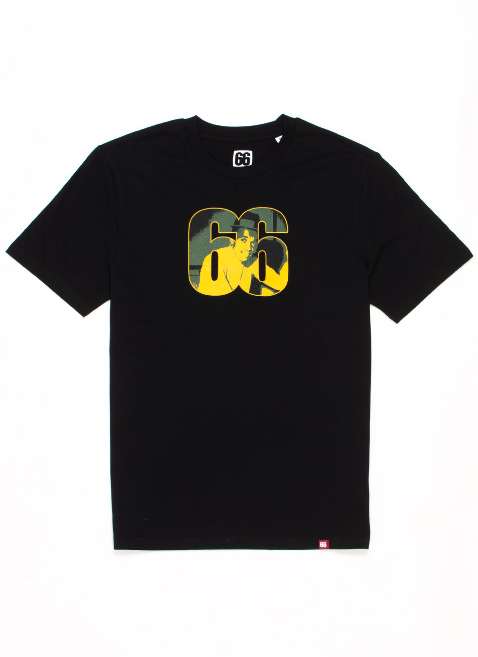 A black tee with a bold yellow-outlined “66” containing an image of Prince Buster, the Jamaican ska and bluebeat pioneer. The print uses yellow and muted greenish tones to capture the energy and attitude of the ska era — cool, rhythmic, and authentic.