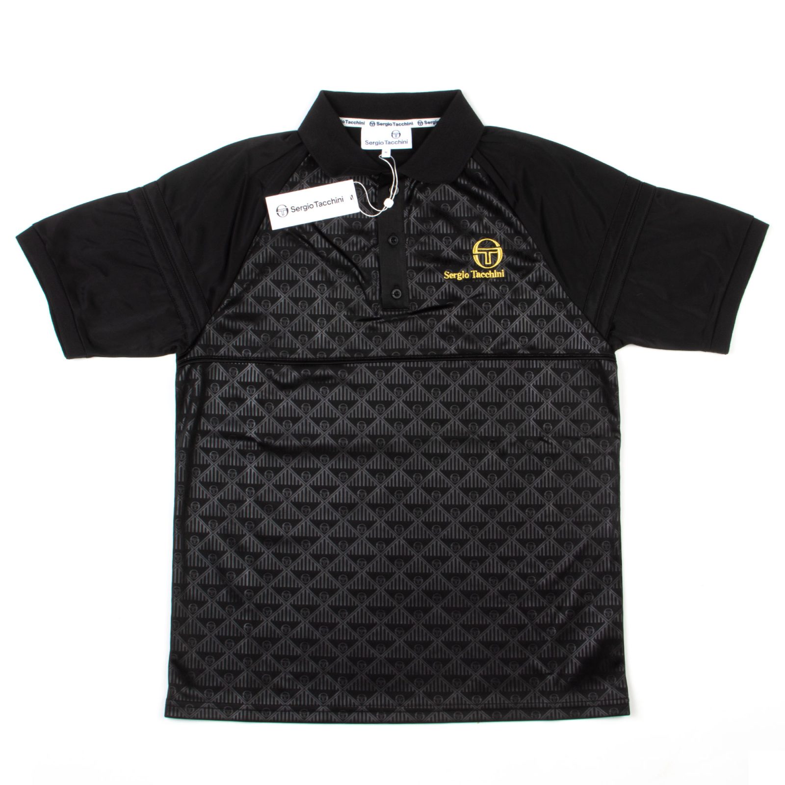The Sergio Tacchini Cambio Mono Polo in Black is a sleek, modern take on the classic polo. Featuring a bold yet sophisticated all-over monogram print, this short-sleeved polo is crafted from lightweight, breathable fabric, making it perfect for both casual and sporty occasions. The solid black raglan sleeves contrast with the patterned torso, while the yellow Sergio Tacchini logo embroidery adds a pop of color.