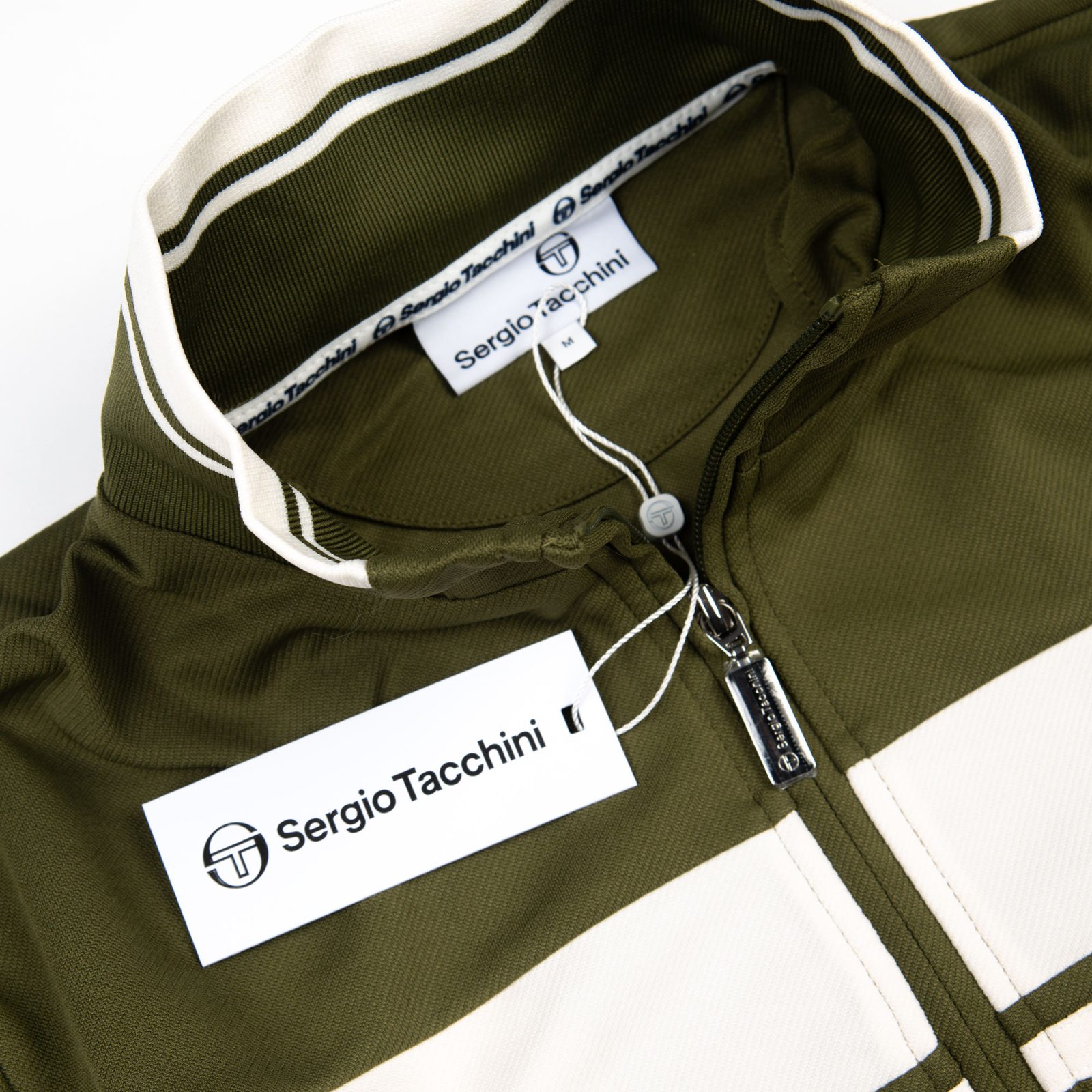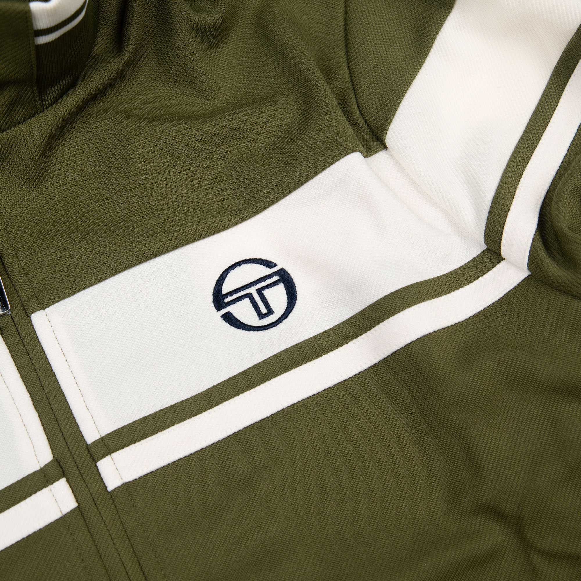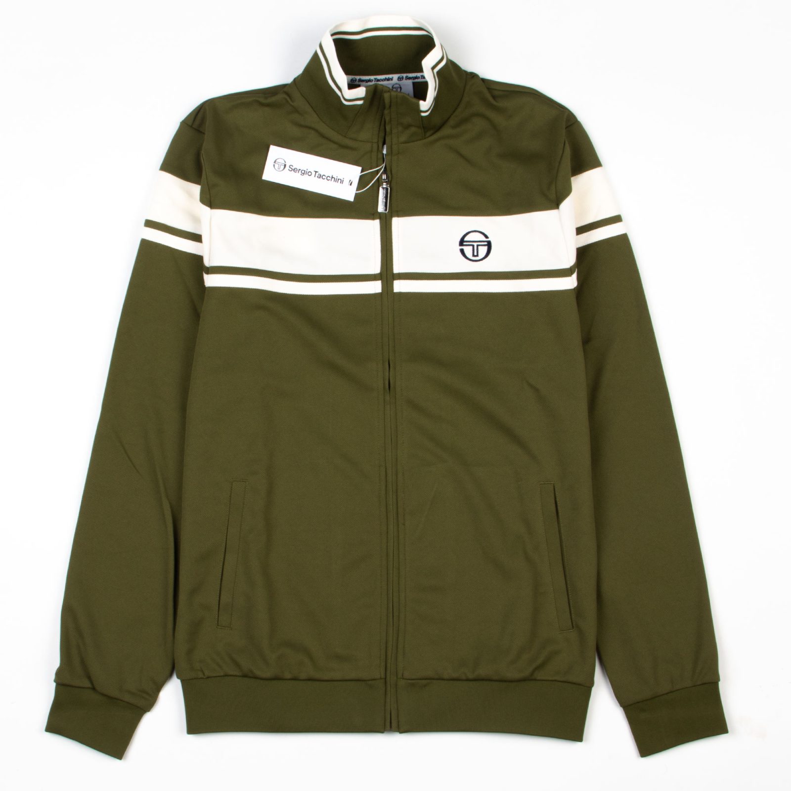 This is a Sergio Tacchini track top in an olive green (sphagnum) and white colourway. It features a classic full-zip closure, a high funnel neck, and a ribbed hem and cuffs for a snug fit. The design is elevated with contrasting white chest stripes and the iconic Sergio Tacchini embroidered logo on the left side of the chest. Two vertical side pockets add functionality while maintaining a streamlined look.
