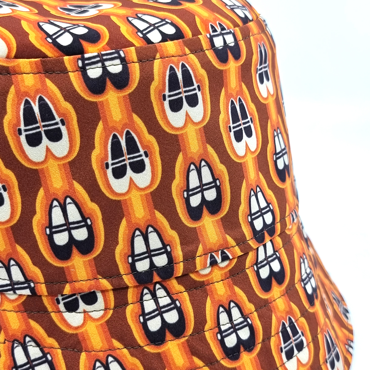 Side 1 A fab psychedelic pattern in shades of orange and brown featuring our classic “Prudence” shoes in black and white