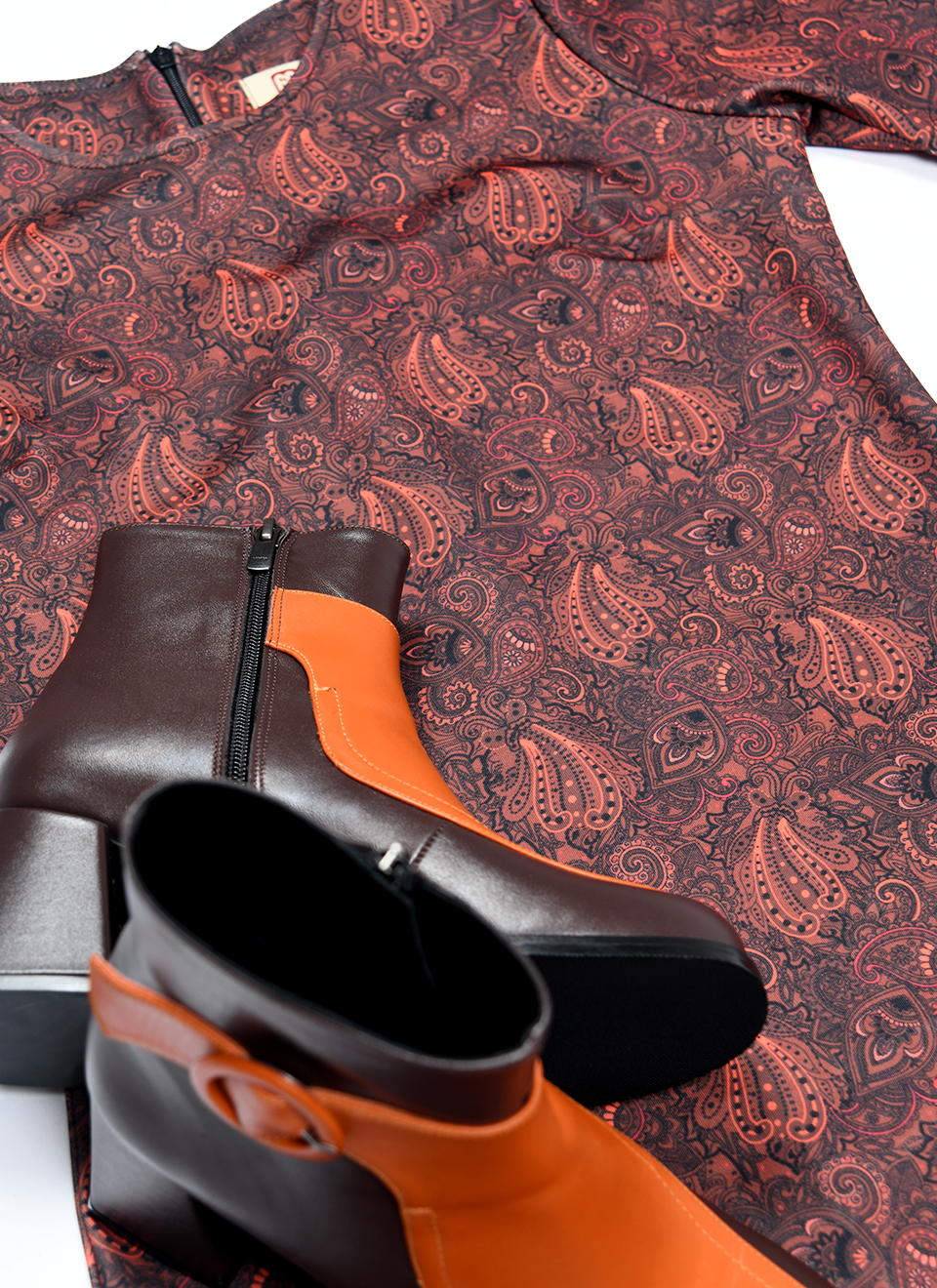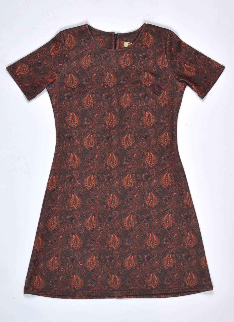 The ‘Carly’ Dress in Chocolate and Orange Paisley – UK Made 60’s Style Mod Dress