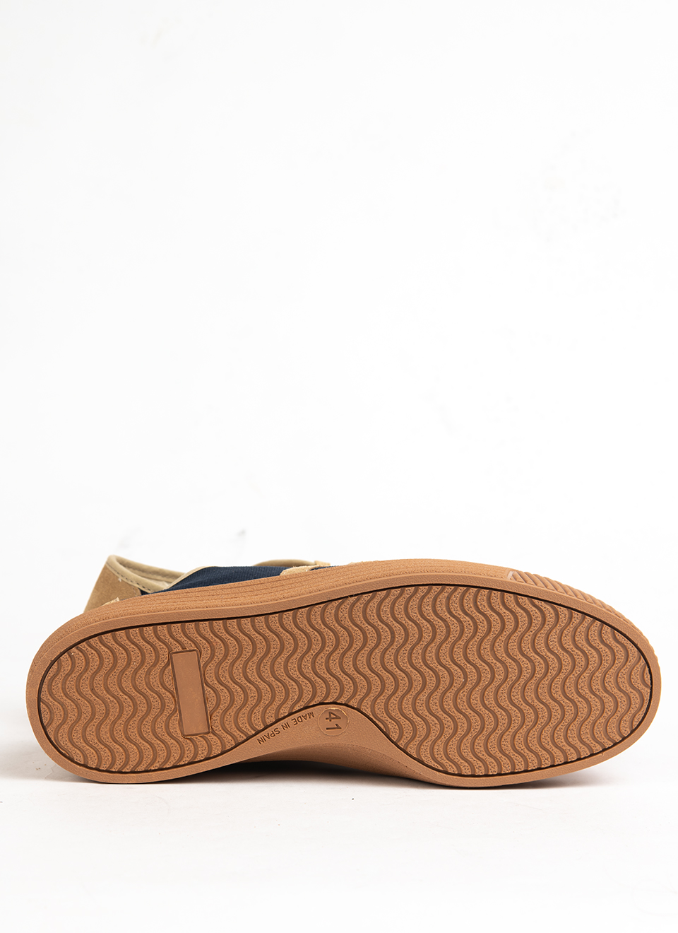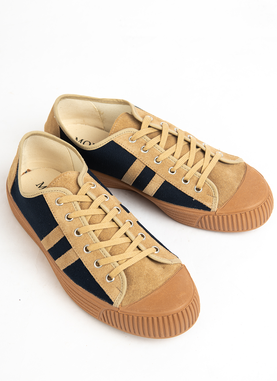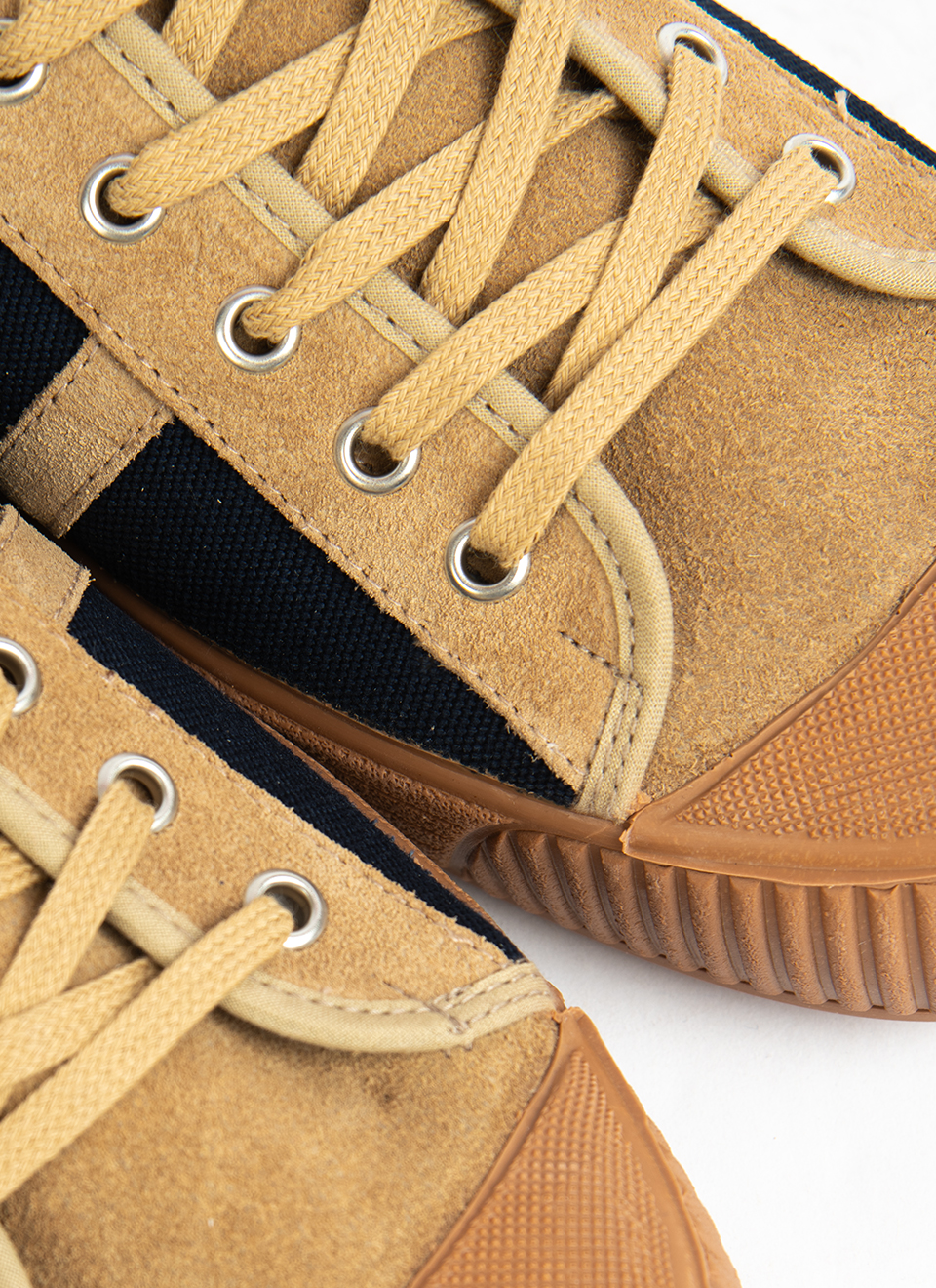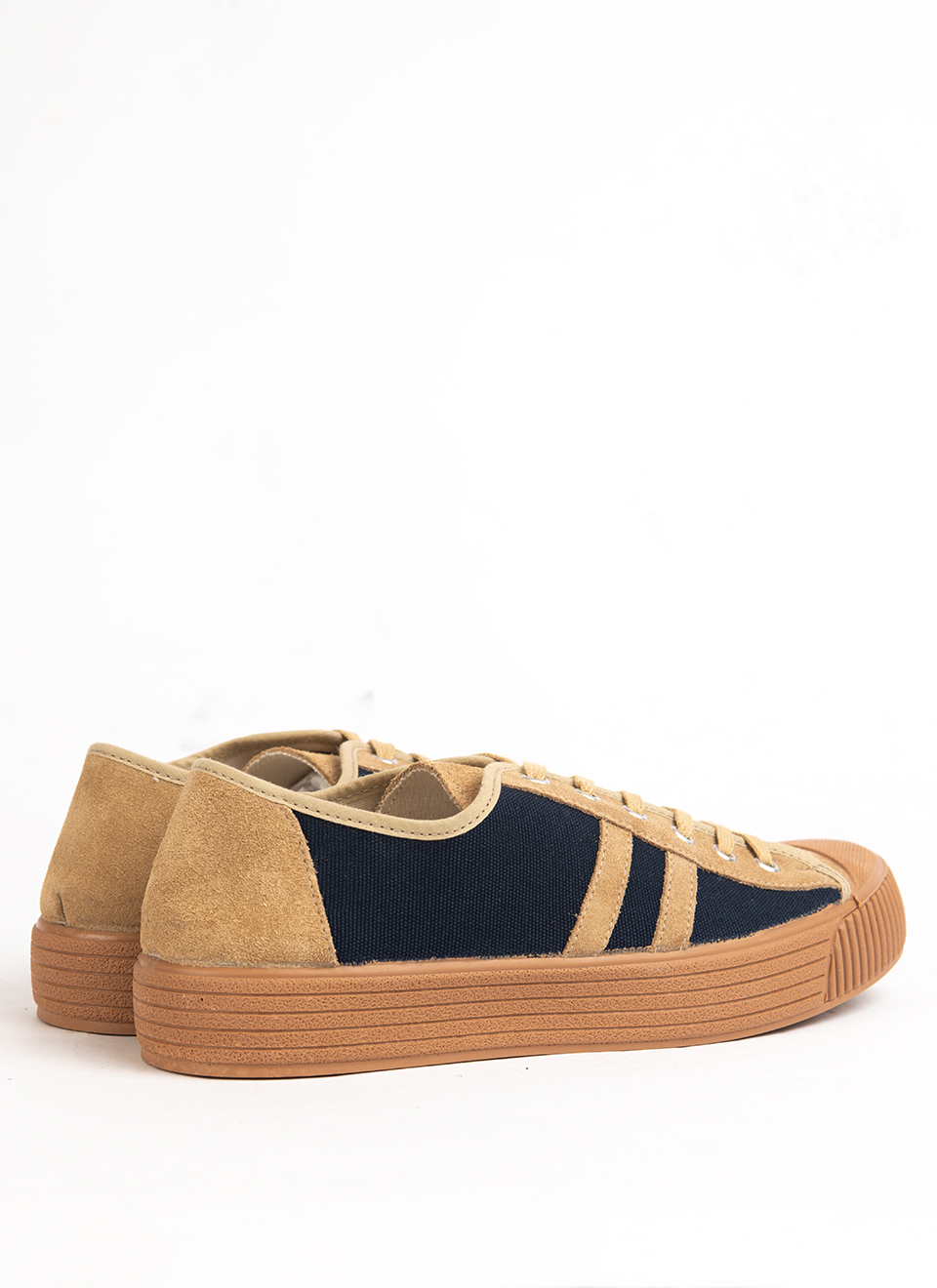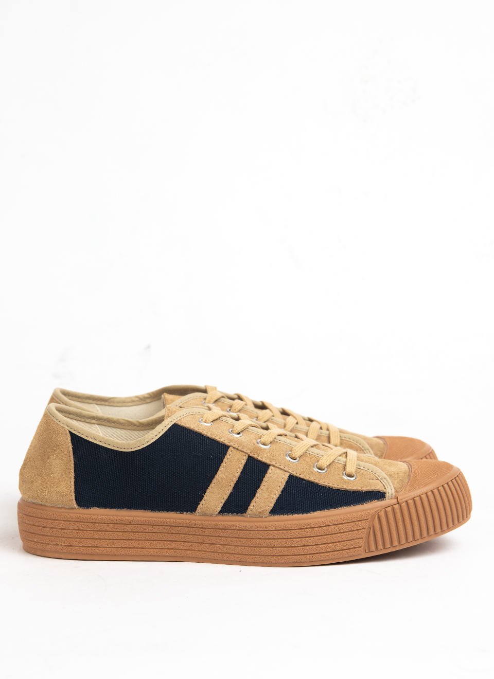 This edition features a classic mix of navy canvas panels and light tan suede overlays, set on a grippy caramel brown rubber sole. The look is finished with vintage-style laces and subtle contrast piping for a clean but unmistakably retro finish.