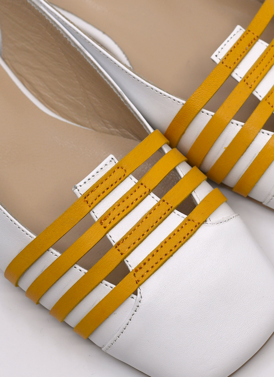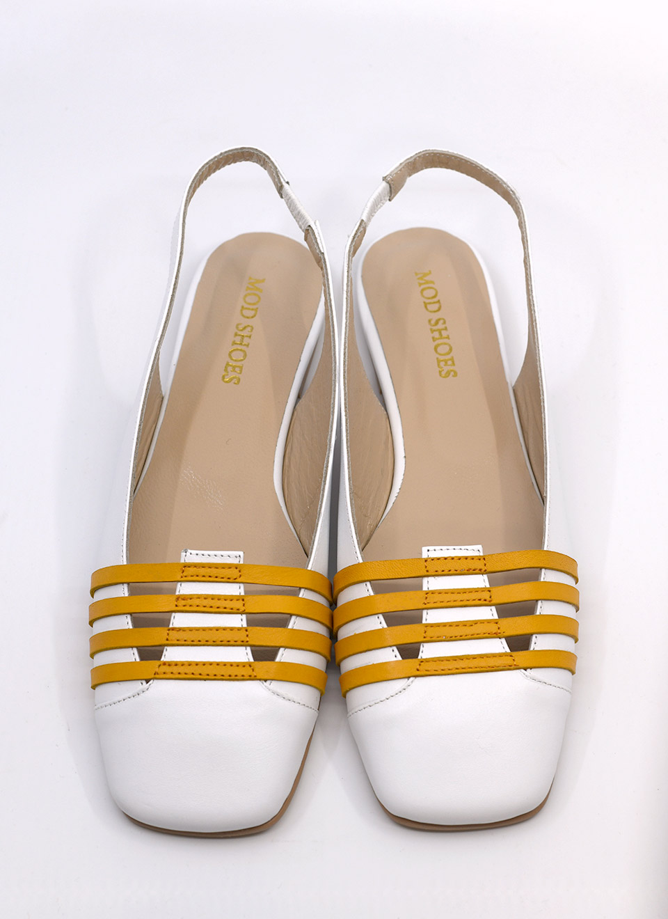 Eleanor comes in two amazing new colourways. Classic Light Blue and Navy trim, and the very Summery white with yellow trim. Style-wise, they would look amazing with our “Lucy” dresses, but would also work with shift dresses, capri pants, skirt suits, the list goes on.