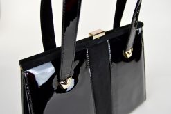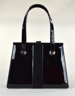 The classic black patent contrasts with a strip of black suede on the front and opening. The added gold coloured metal clasp and fittings add the finishing touch of opulence.