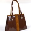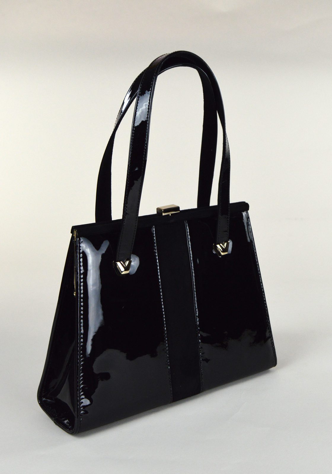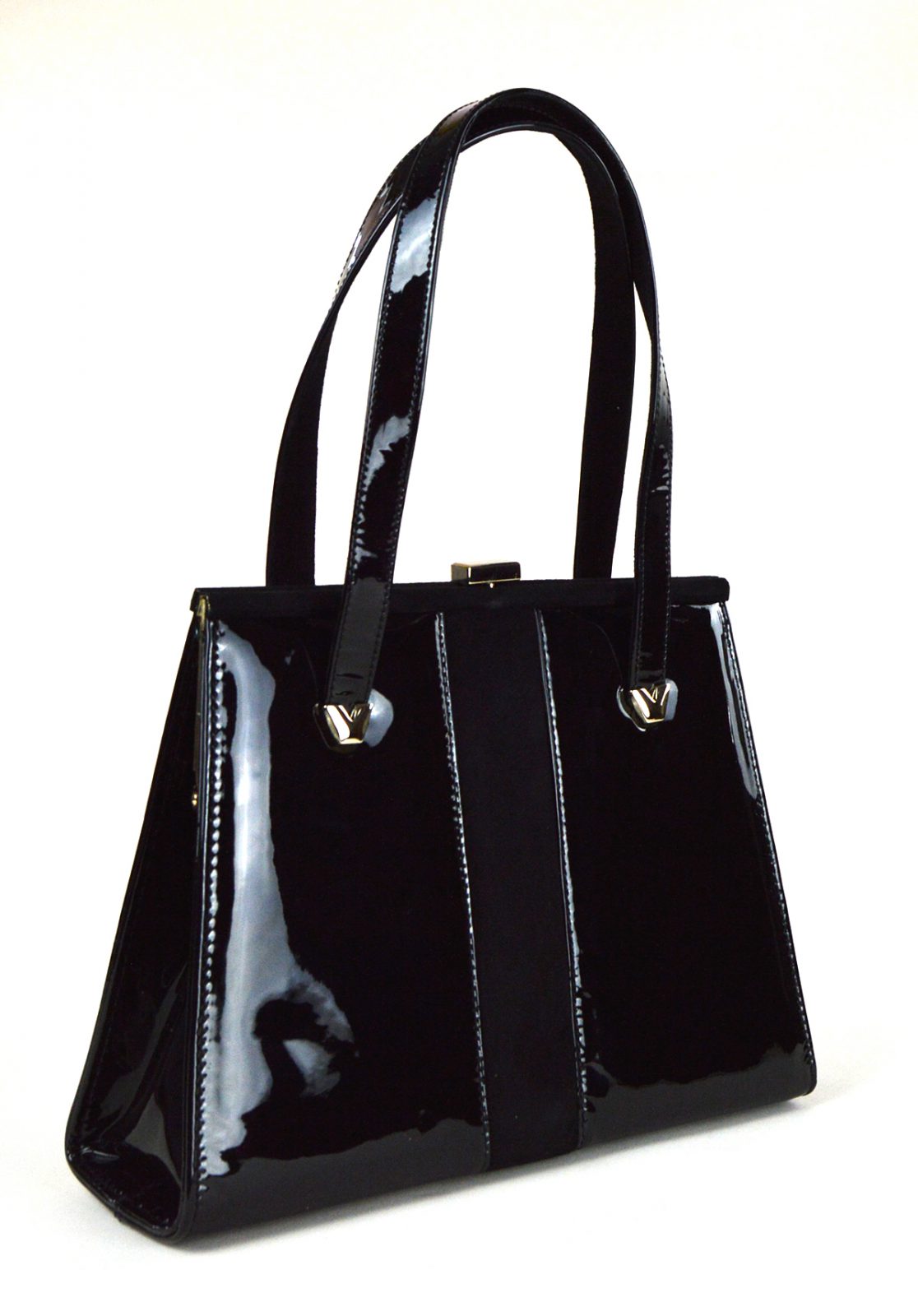 The classic black patent contrasts with a strip of black suede on the front and opening. The added gold coloured metal clasp and fittings add the finishing touch of opulence.