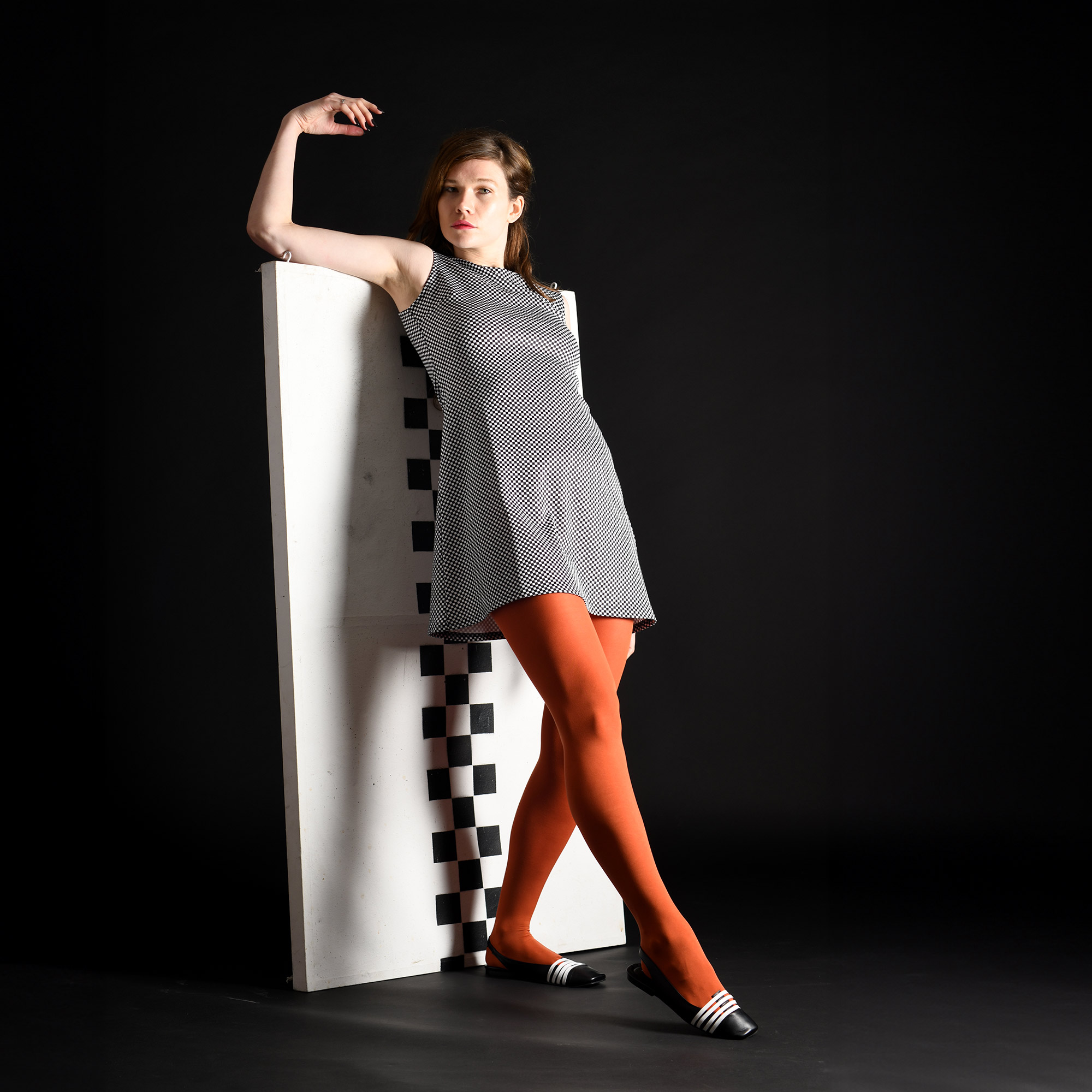 Style-wise, the Lucy looks perfect on its own, but also works really well with a co-ordinating polo-neck sweater underneath, pinafore style. Team it with matching or contrasting tights for a cool 60’s look. Pair with our new black and white “Eleanor” shoes, for the perfect monochrome styling.