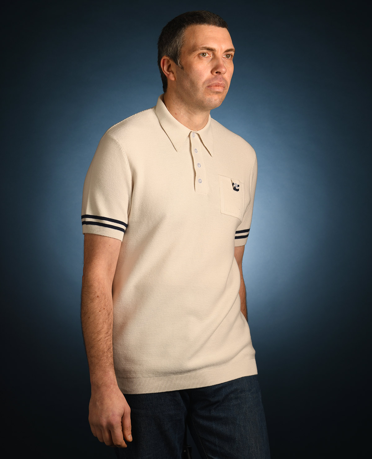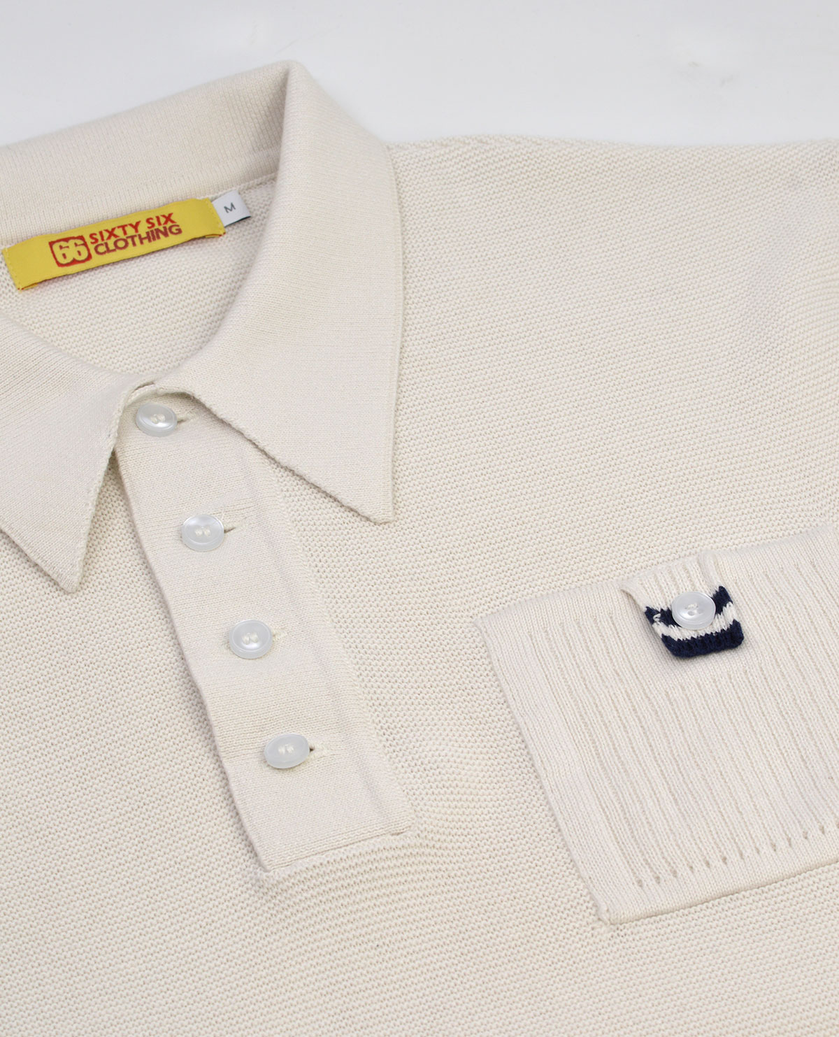 This stylish knit polo is made from 100% cotton, and was inspired by a vintage item sourced by us here at 66 Clothing. We loved the simplicity of the tipping and the matching detail on the pocket, which you can see in the close image and video.