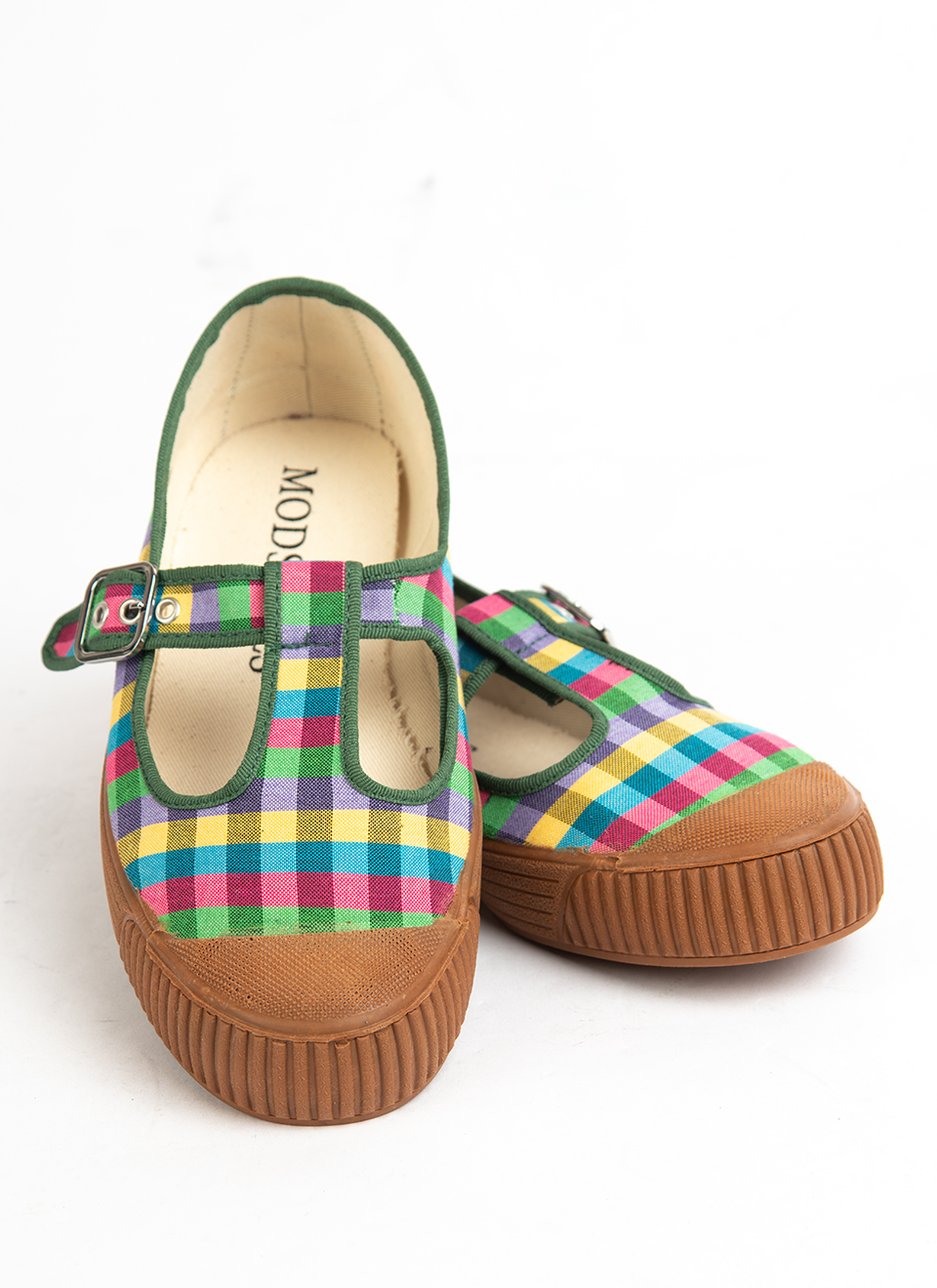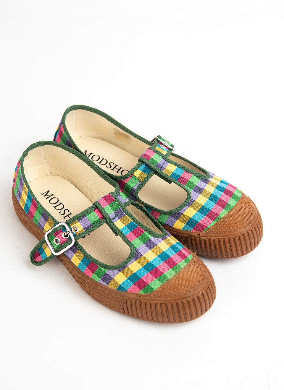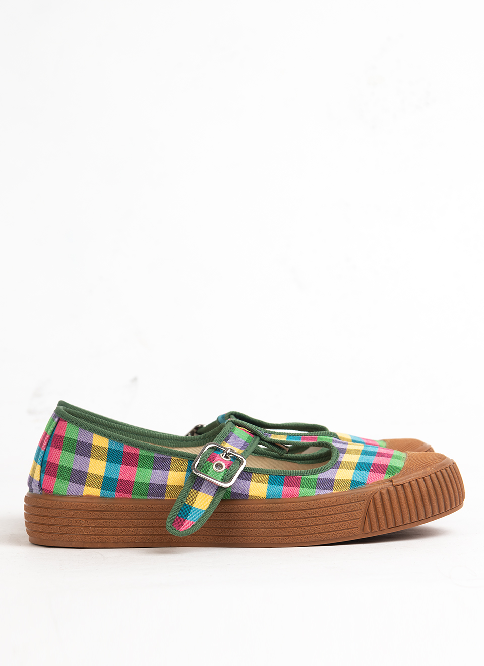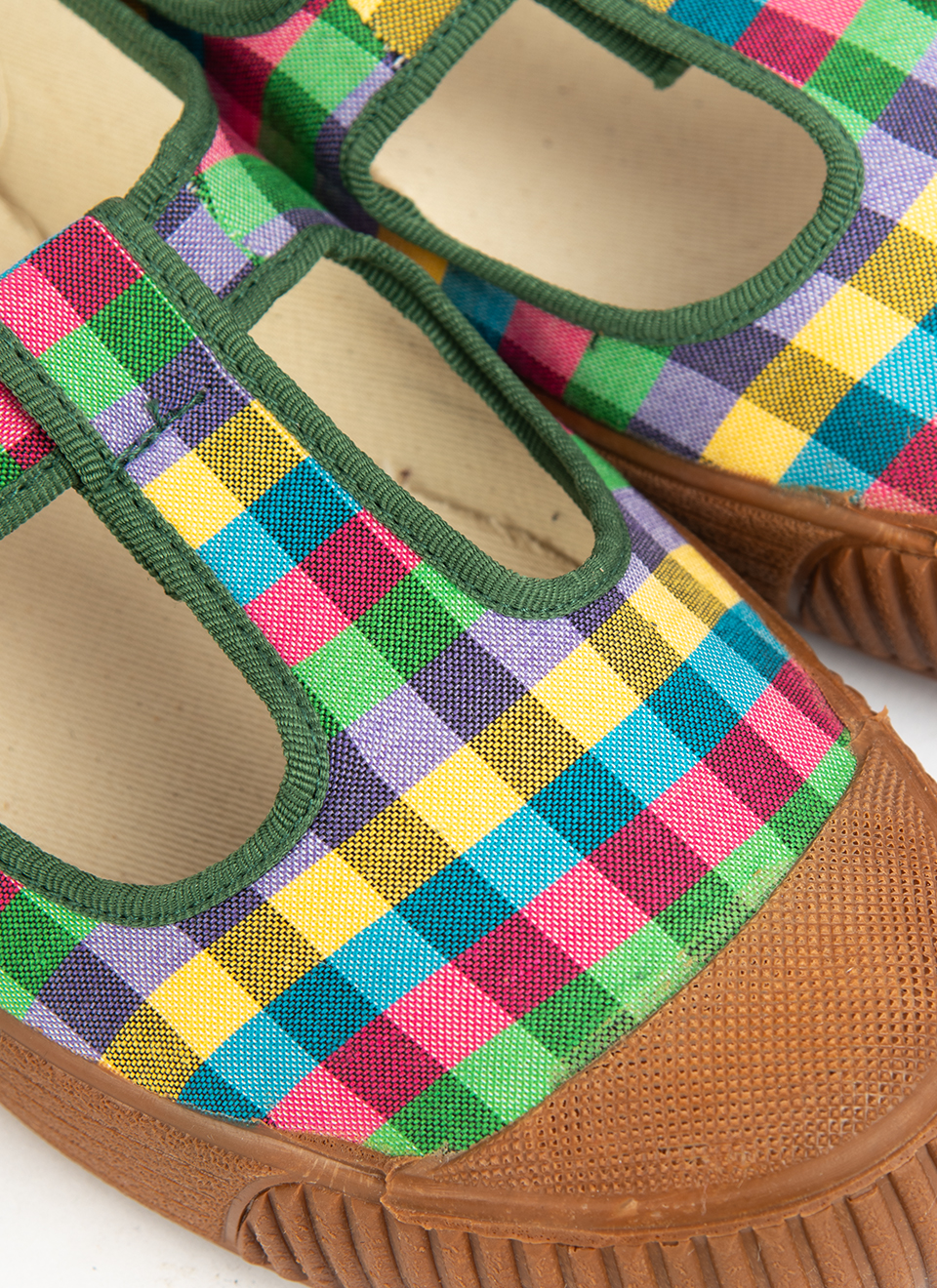 Featuring a classic T-bar design with buckle fastening, this limited-edition shoe is crafted in a bold multicolour check with green trim and a durable caramel rubber sole. The lightweight canvas upper makes it perfect for warm-weather wear.