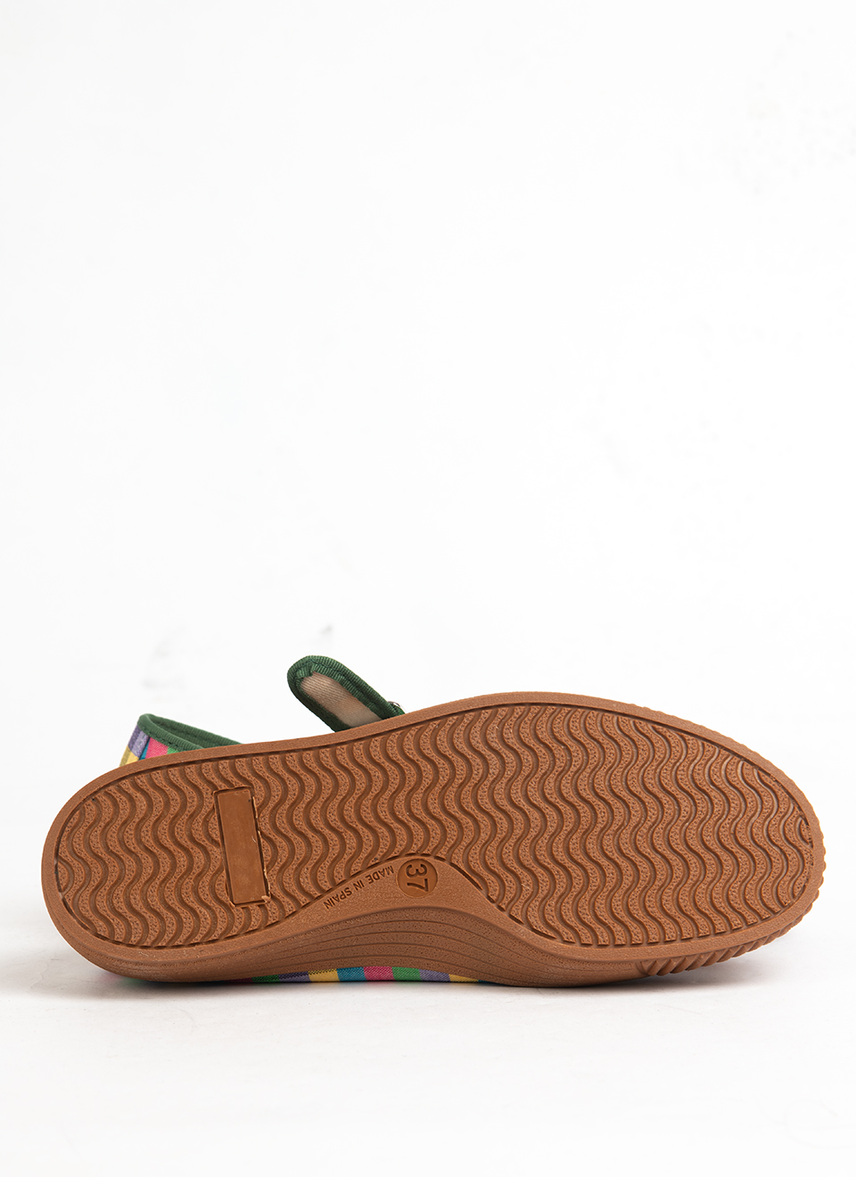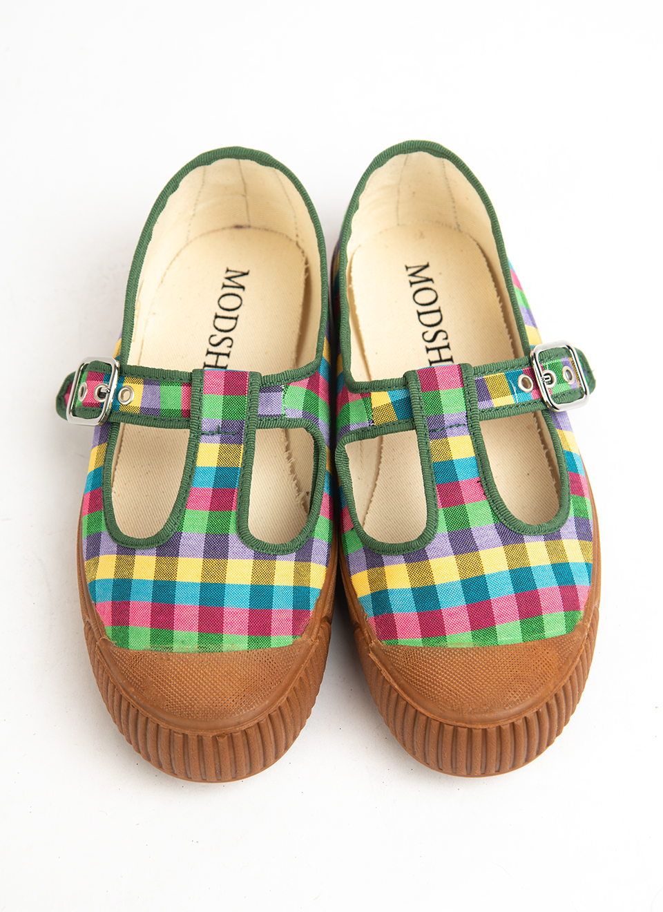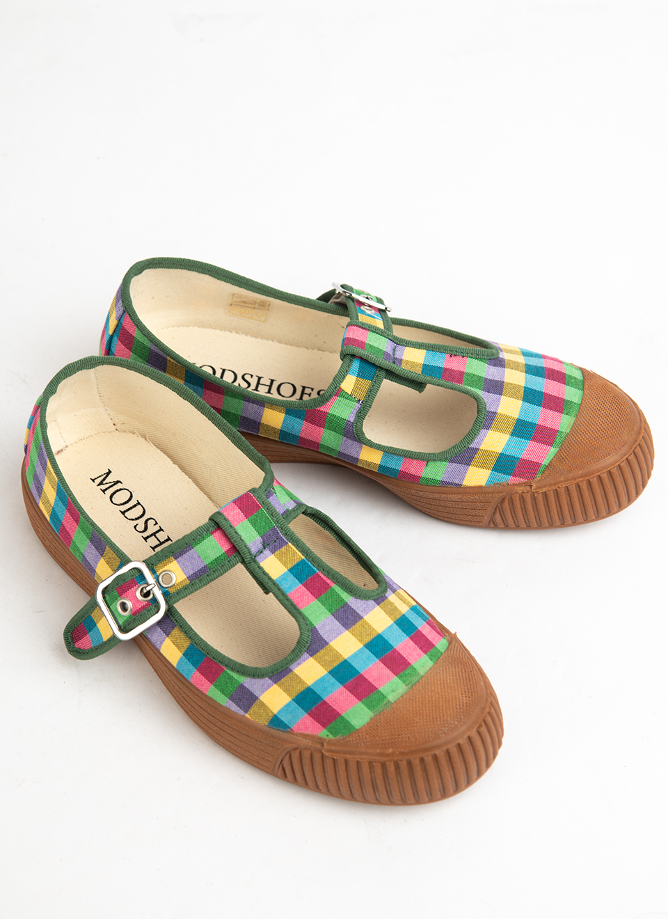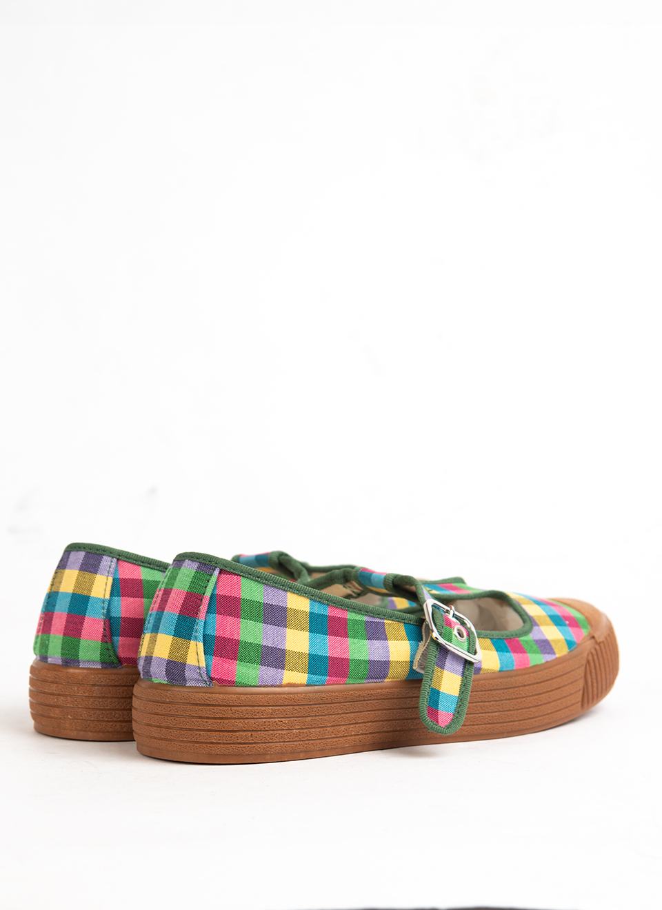 Featuring a classic T-bar design with buckle fastening, this limited-edition shoe is crafted in a bold multicolour check with green trim and a durable caramel rubber sole. The lightweight canvas upper makes it perfect for warm-weather wear.